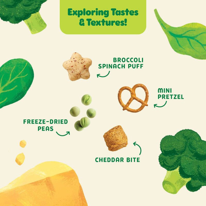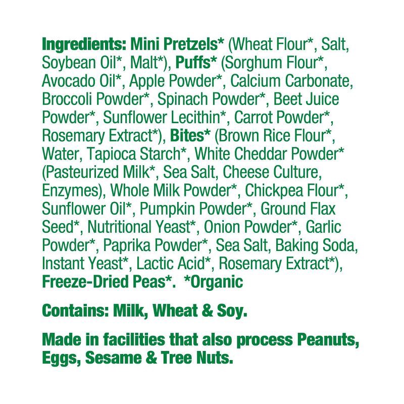 Mini Pretzels* (Wheat Flour*, Salt, Soybean Oil*, Malt*), Puffs* (Sorghum Flour* Avocado Oil*, Apple Powder*, Calcium Carbonate, Broccoli Powder*, Spinach Powder*, Beet Juice Powder*, Sunflower Lecith…