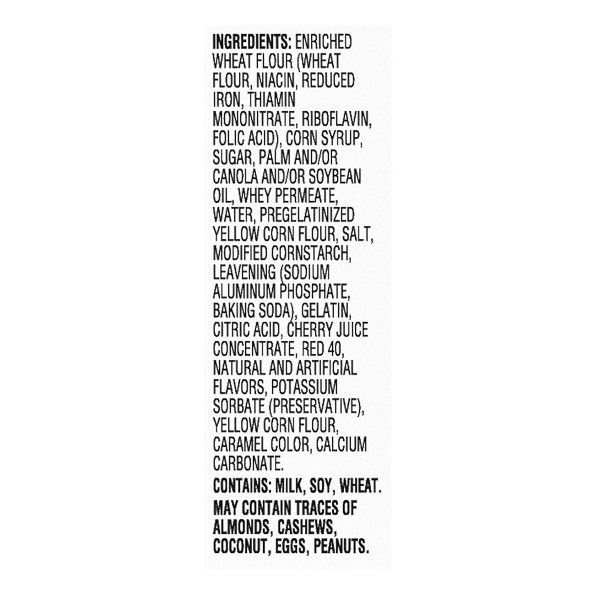 Enriched Wheat Flour (Wheat Flour, Niacin, Reduced Iron, Thiamin Mononitrate, Riboflavin, Folic Acid), Corn Syrup, Sugar, Palm and/or Canola and/or Soybean Oil, Whey Permeate, Water, Pregelatinized Ye…