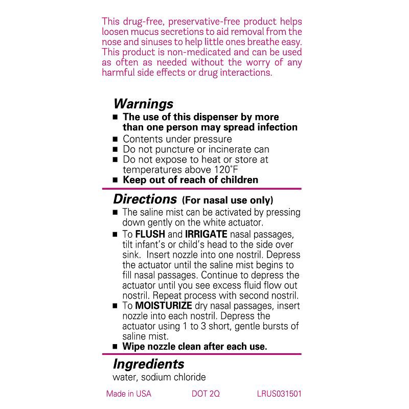 - Nasal saline spray contains no alcohol and is drug- and preservative-free