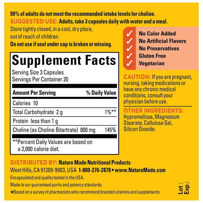 - Brain health support supplement: contains one 60 count bottle of Nature Made Extra Strength Dosage Choline 800 mg per serving Capsules for a 20-day supply