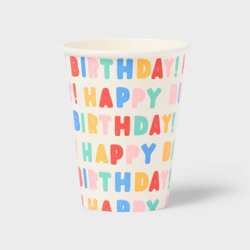 - Multicolor “Happy Birthday” paper cups for party drinks