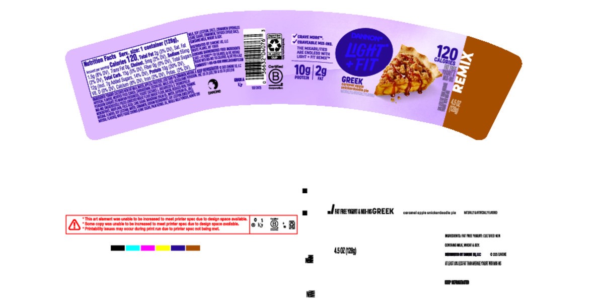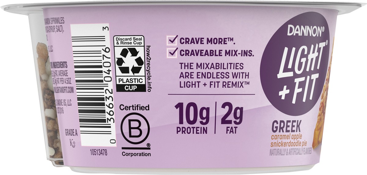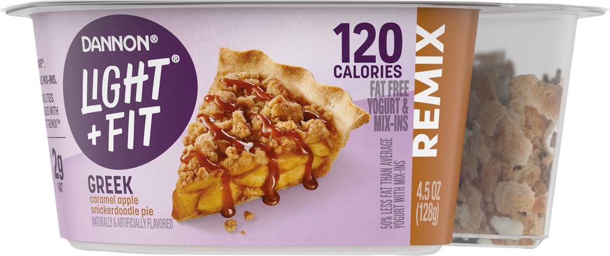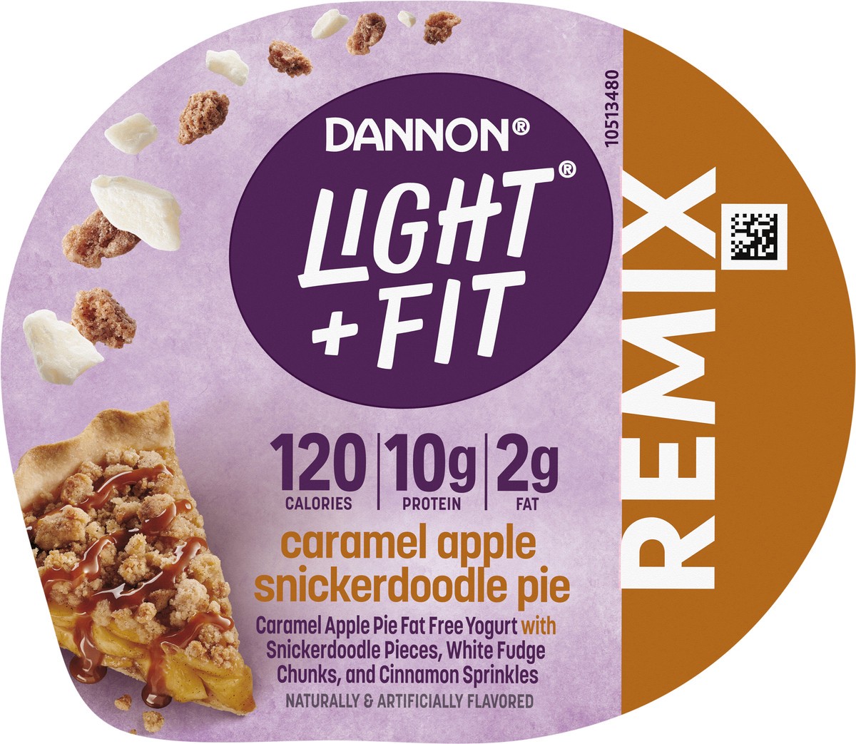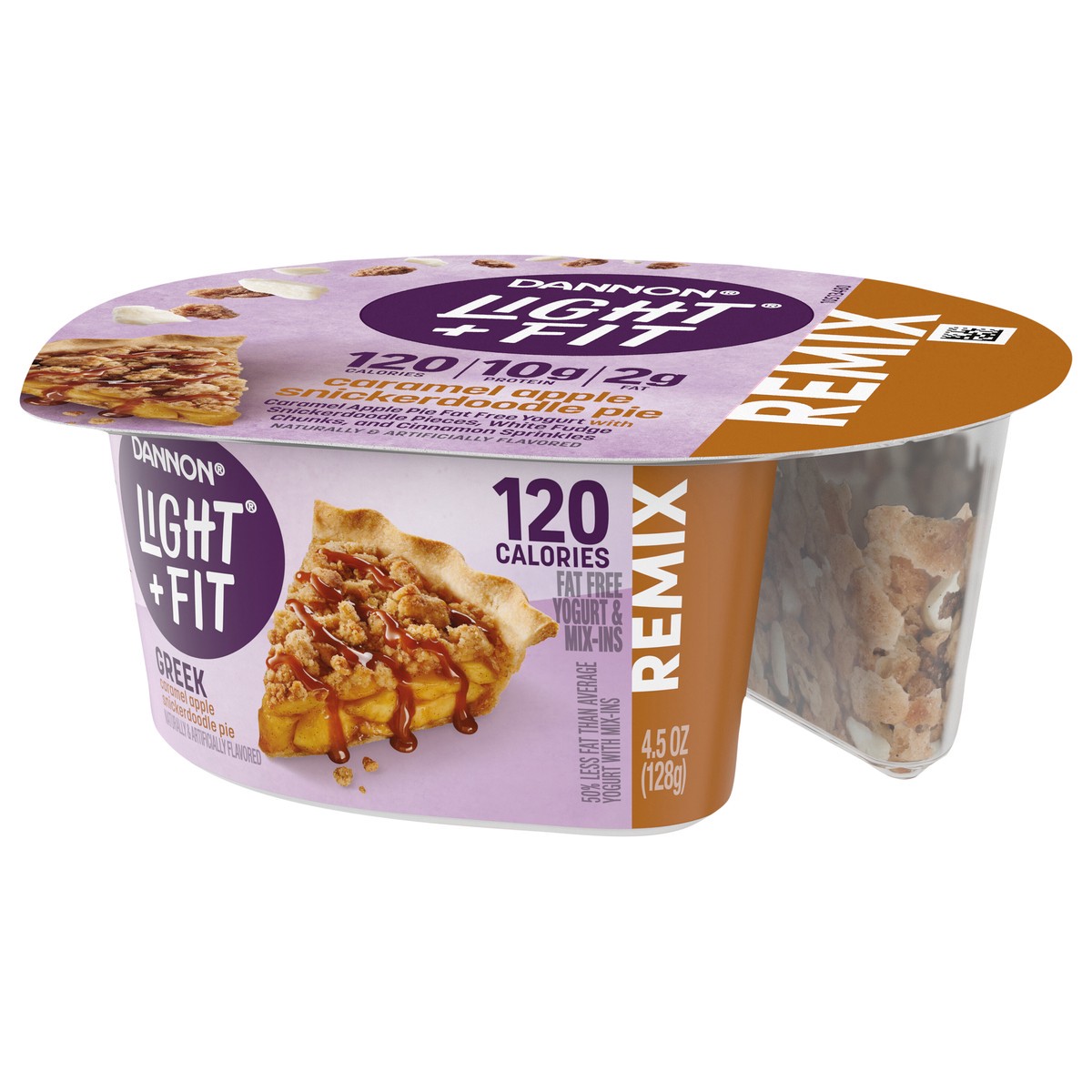 - JUST GRAB YOUR SPOON AND ENJOY: One 4.5 oz cup of Dannon Light + Fit REMIX Caramel Apple Pie Flavored Fat Free Greek Yogurt with Snickerdoodle Pieces, White Fudge Chunks and Cinnamon Sprinkles Mix-Ins