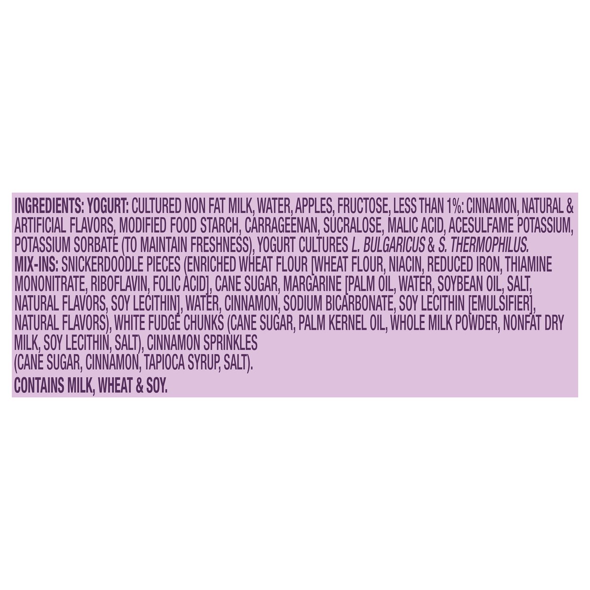 Yogurt: Cultured Non Fat Milk, Water, Apples, Fructose, Less than 1%: Cinnamon, Natural & Artificial Flavors, Modified Food Starch, Carrageenan, Sucralose, Malic Acid, Acesulfame Potassium, Potassium …