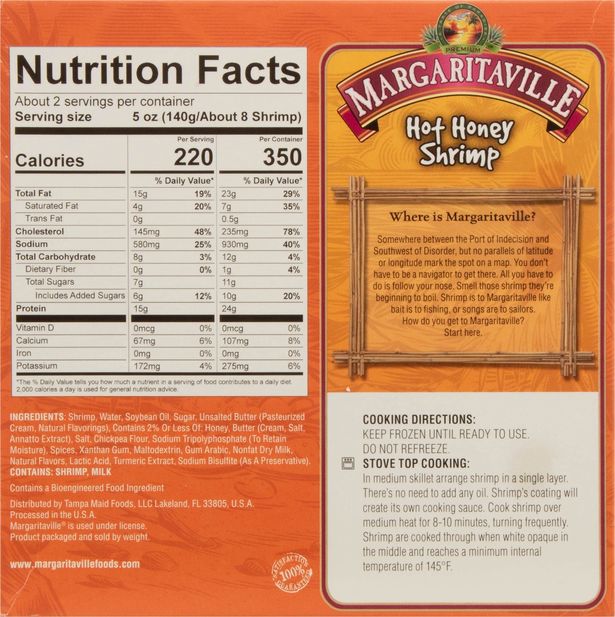 Shrimp, Water, Soybean Oil, Sugar, Unsalted Butter (Pasteurized Cream, Natural Flavorings), Contains 2% or Less of: Honey, Butter (Cream, Salt, Annatto Extract), Salt, Chickpea Flour, Sodium Tripolyph…
