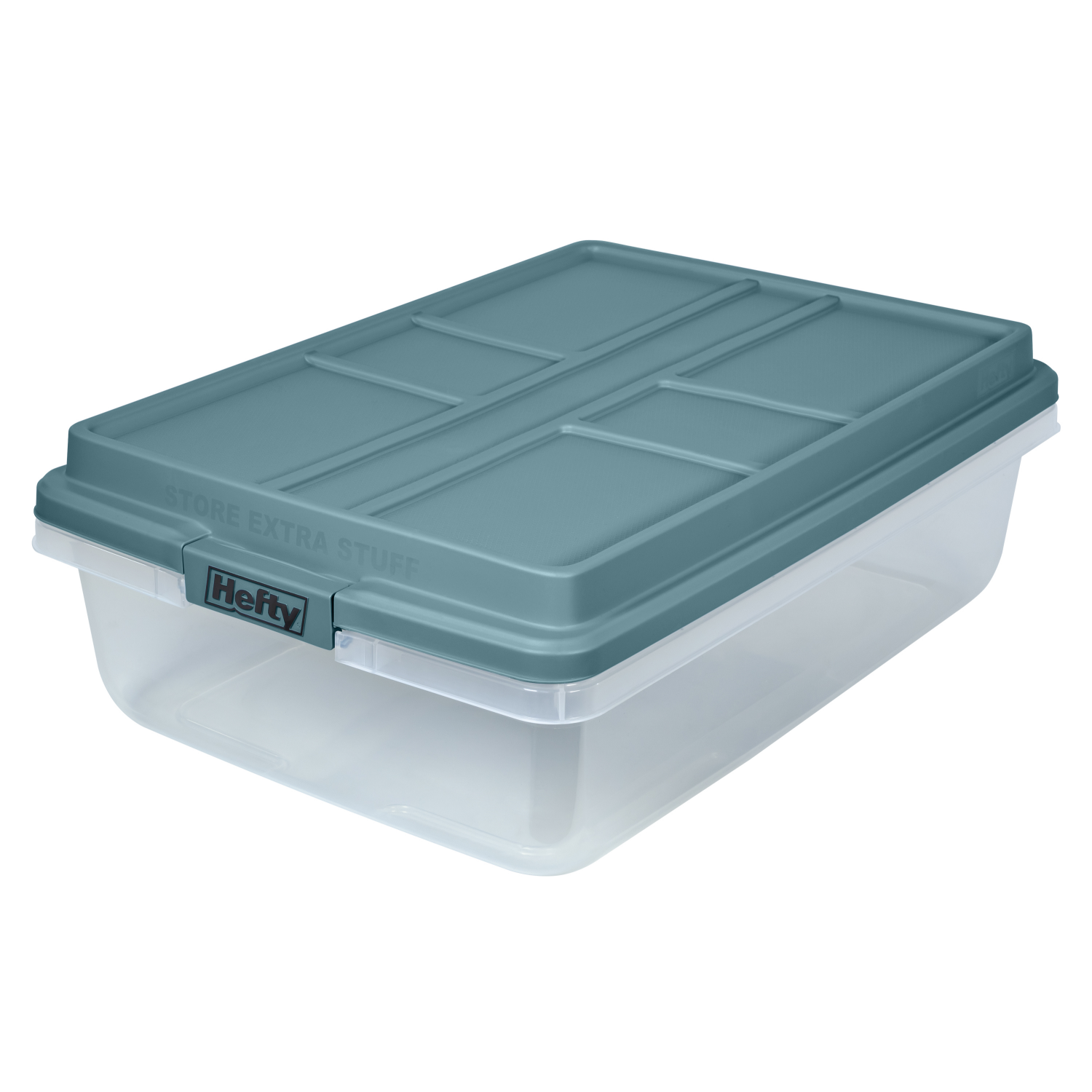 The 40qt Hefty HI RISE Storage Bin is an ideal storage solution for under the bed and low shelf storage. This product stacks securely for optimal space saving. The innovative HI RISE lid allows for ab…