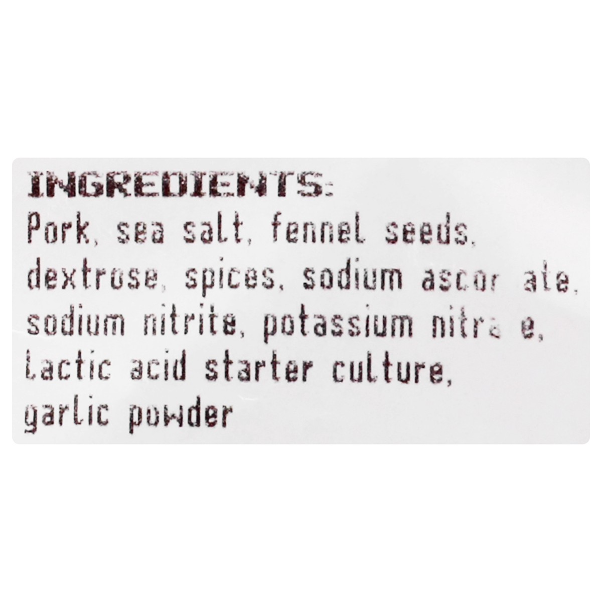 Pork, Sea Salt, Fennel Seeds, Dextrose, Spices, Sodium Ascorbate, Sodium Nitrite, Potassium Nitrate, Lactic Acid Starter Culture, Garlic Powder.