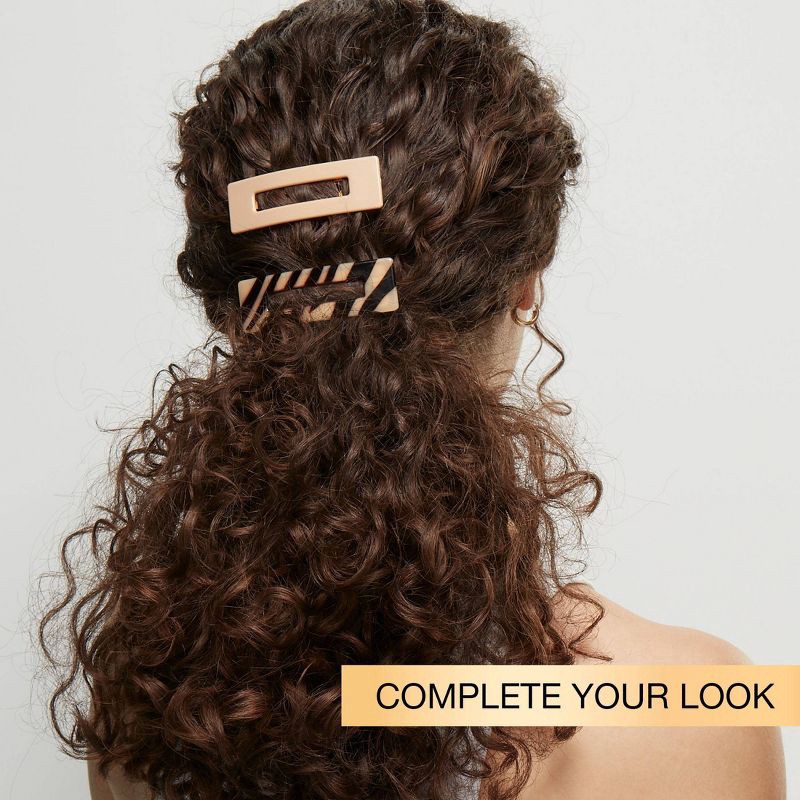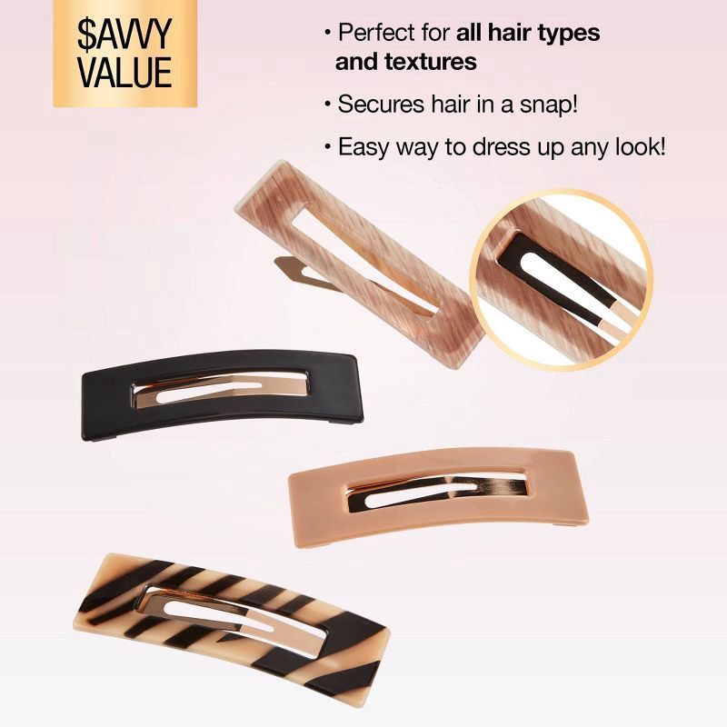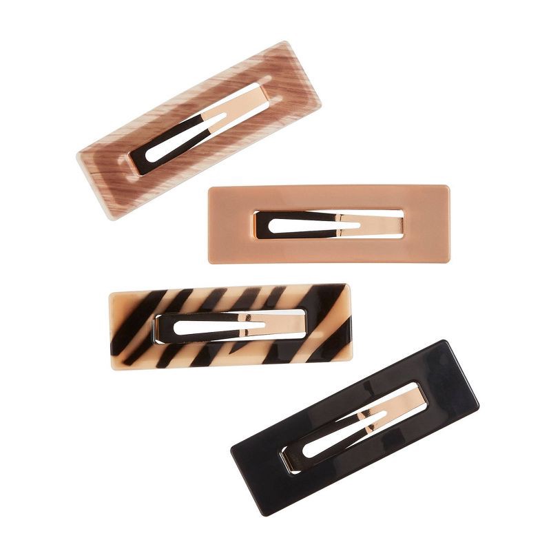 Elevate your style effortlessly with this 4-pack of scünci® Trend Essentials snap clips, featuring chic finishes like woodgrain, beige, zebra stripes, and classic black. Designed for all-day comfort w…