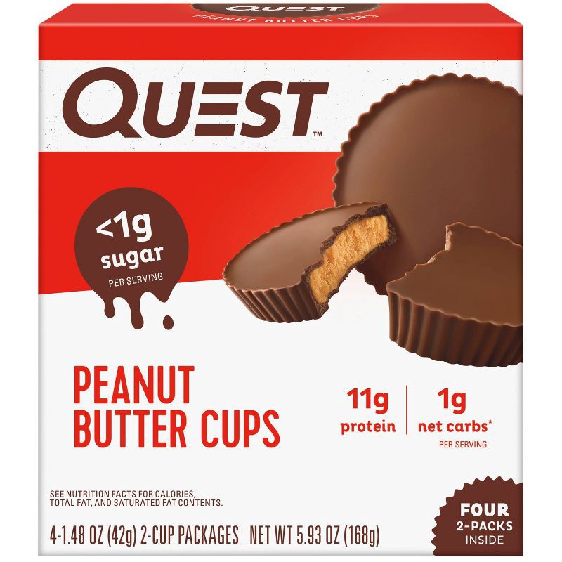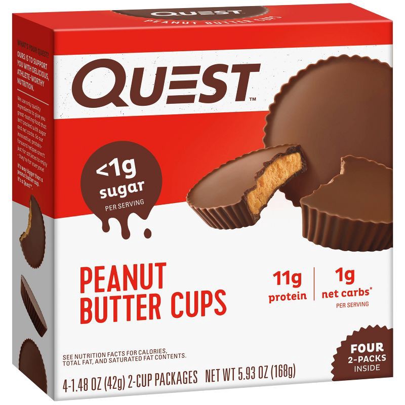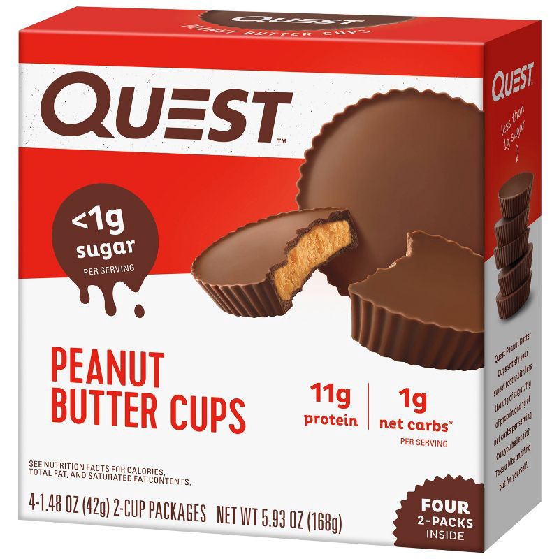 - Quest Peanut Butter Cups are indulgent treats that satisfy your sweet tooth with less than 1g of sugar and 1g of net carbs per serving.