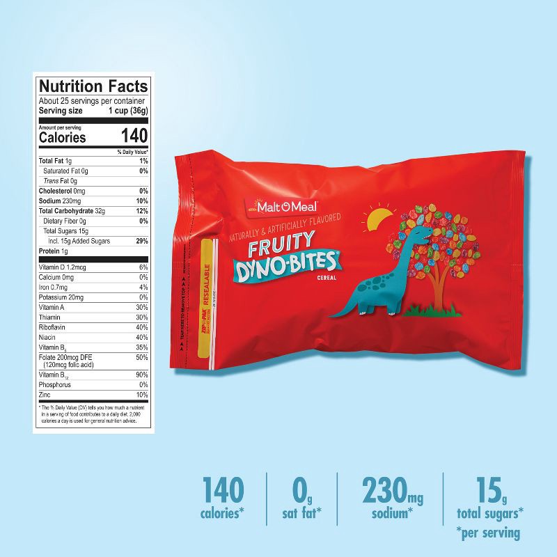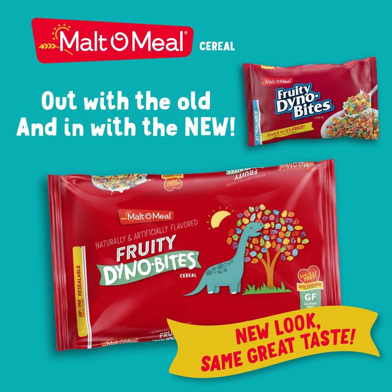 - Never run out of fruity cereal for the family when you buy this family size cereal bag of Malt O Meal Fruity Dyno Bites Cereal