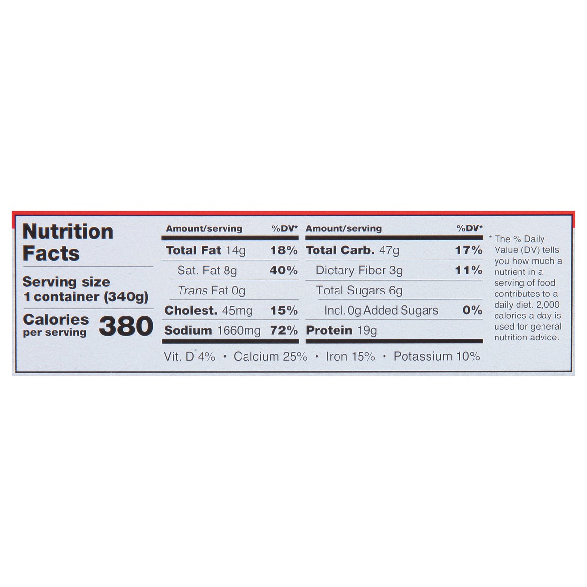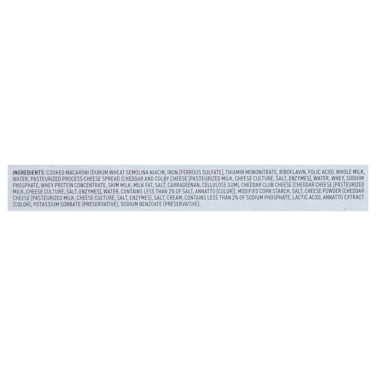 Cooked Macaroni (Durum Wheat Semolina Niacin, Iron [Ferrous Sulfate], Thiamin Mononitrate, Riboflavin, Folic Acid), Whole Milk, Water, Pasteurized Process Cheese Spread (Cheddar and Colby Cheese [Past…