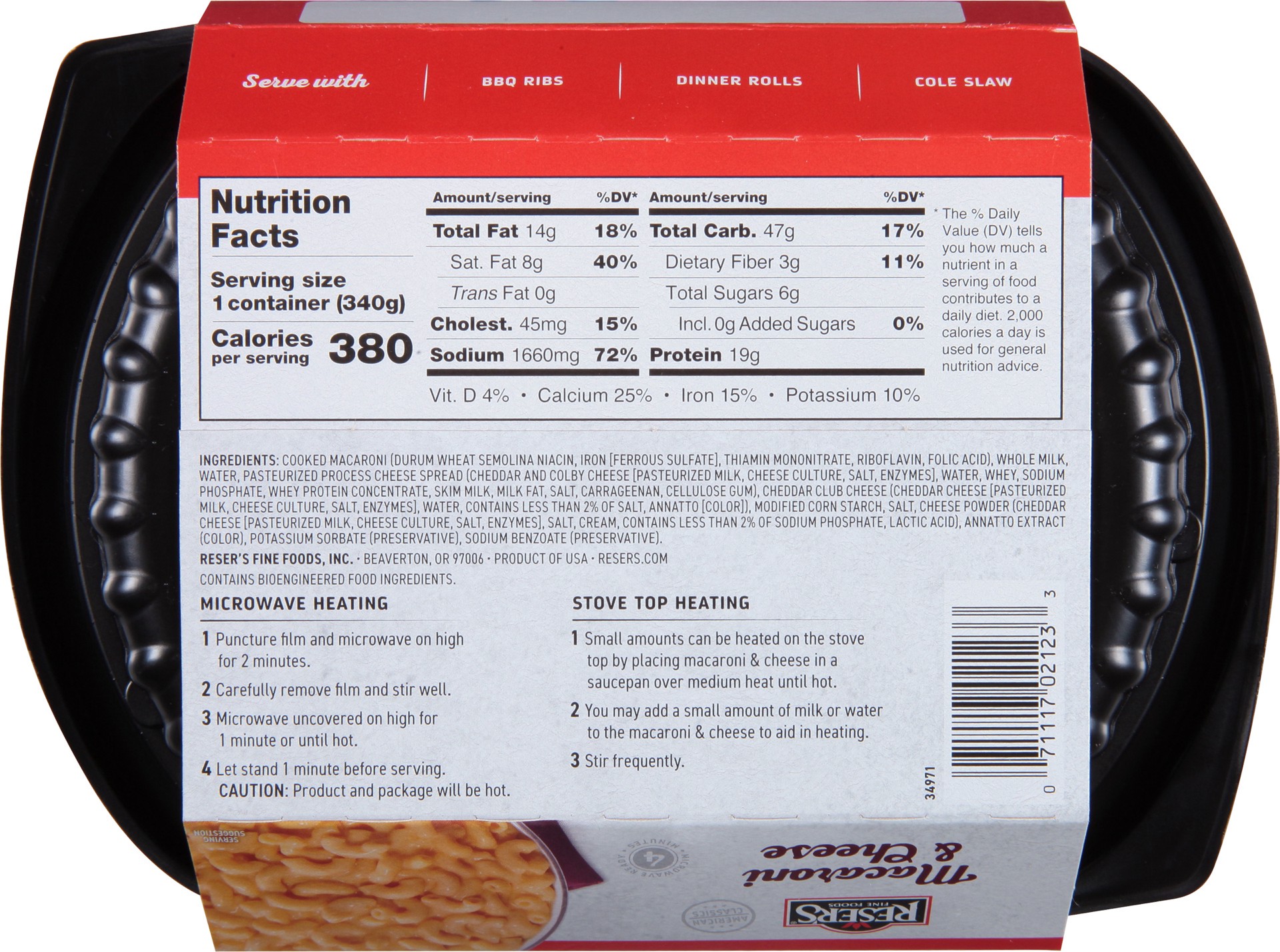 Reser's Macaroni & Cheese is a delicious side dish recipe with tender elbow macaroni in a silky smooth cheddar cheese sauce made with real cheddar cheese, whole milk and butter. Fully prepared and rea…