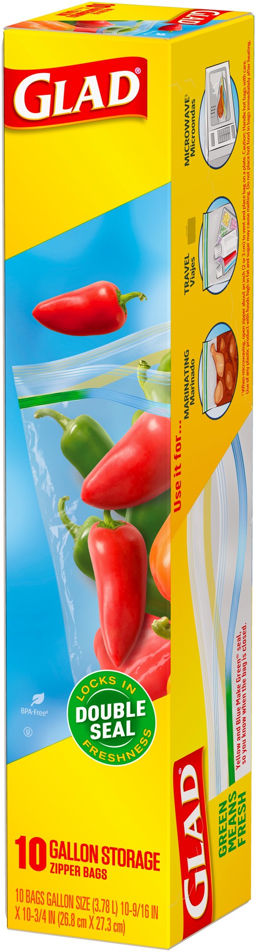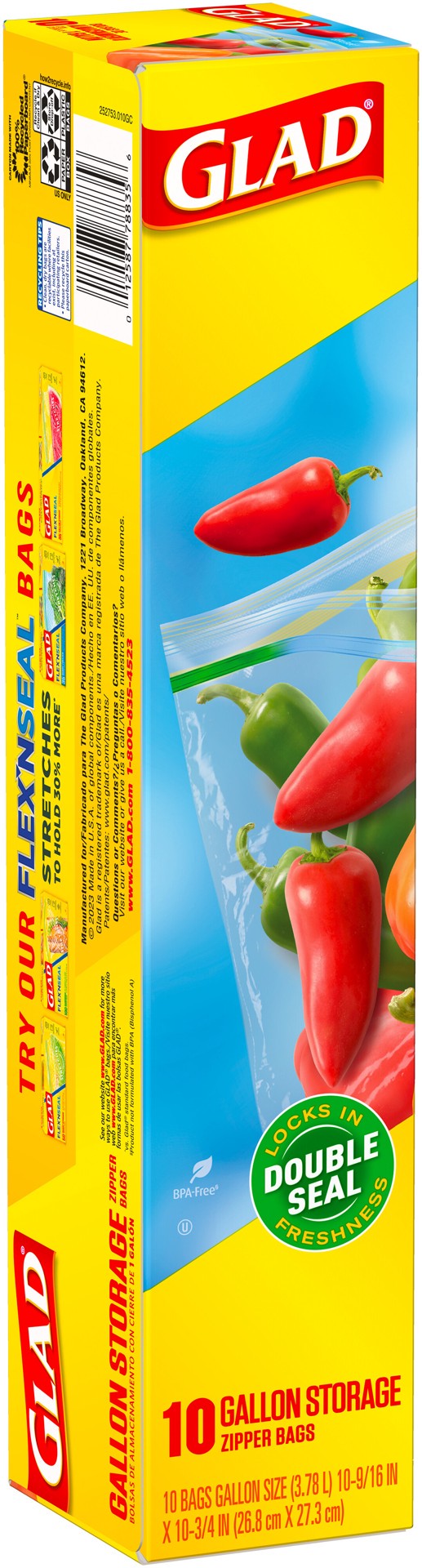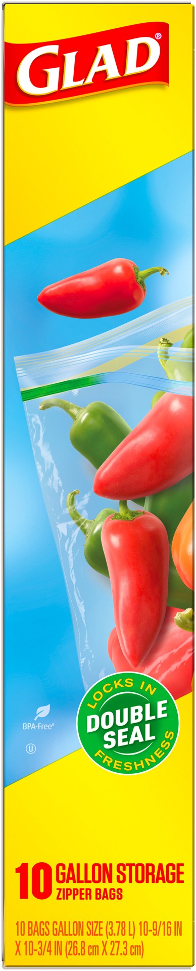 - GALLON PLASTIC STORAGE BAGS: Glad gallon storage zipper bags are formulated without BPA, have a zipper closure and provide solutions for a variety of different storage needs; packaging may vary