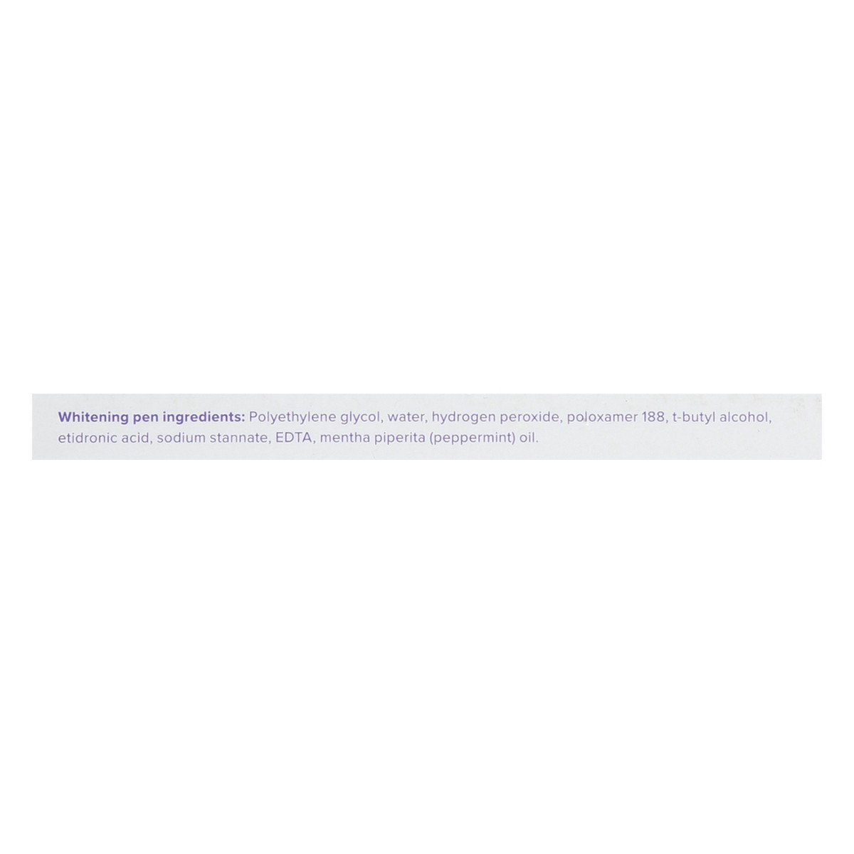 Whitening Pen Ingredients: Polyethylene Glycol, Water, Hydrogen Peroxide, Poloxamer 188, T-Butyl Alcohol, Etidronic Acid, Sodium Stannate, EDTA, Mentha Piperita (Peppermint) Oil.