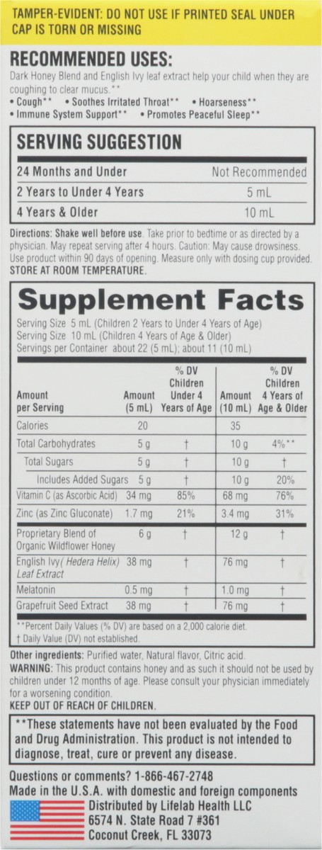Proprietary Blend of Organic Wildflower Honey, English Ivy (Hedera Helix) Leaf Extact, Melatonin, Grapefruit Seed Extract. Other Ingredients: Purified Water, Natural Flavor, Citric Acid.