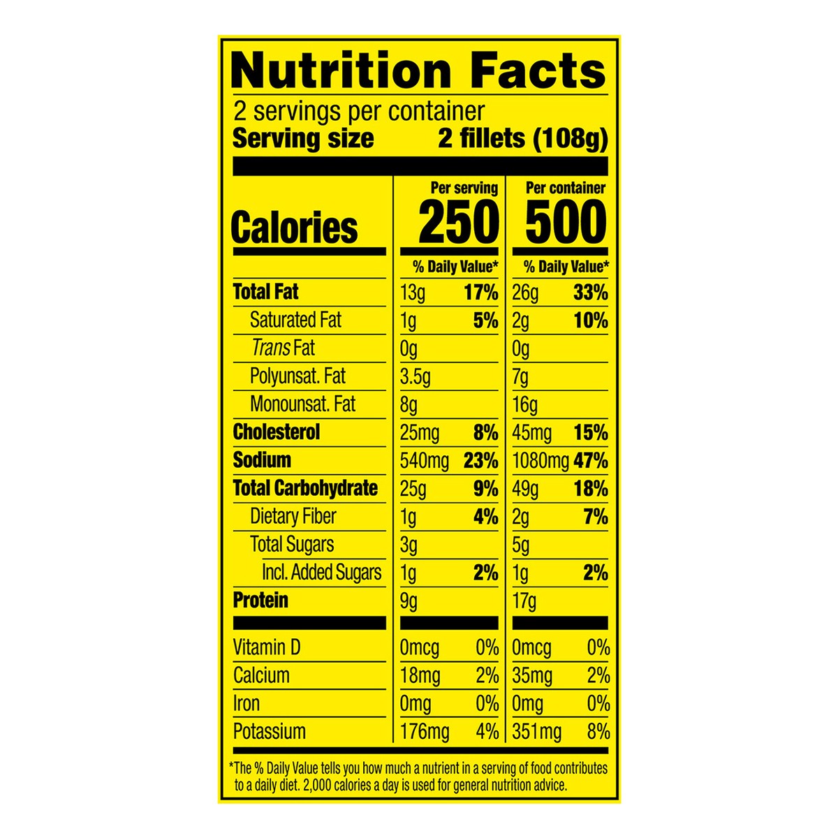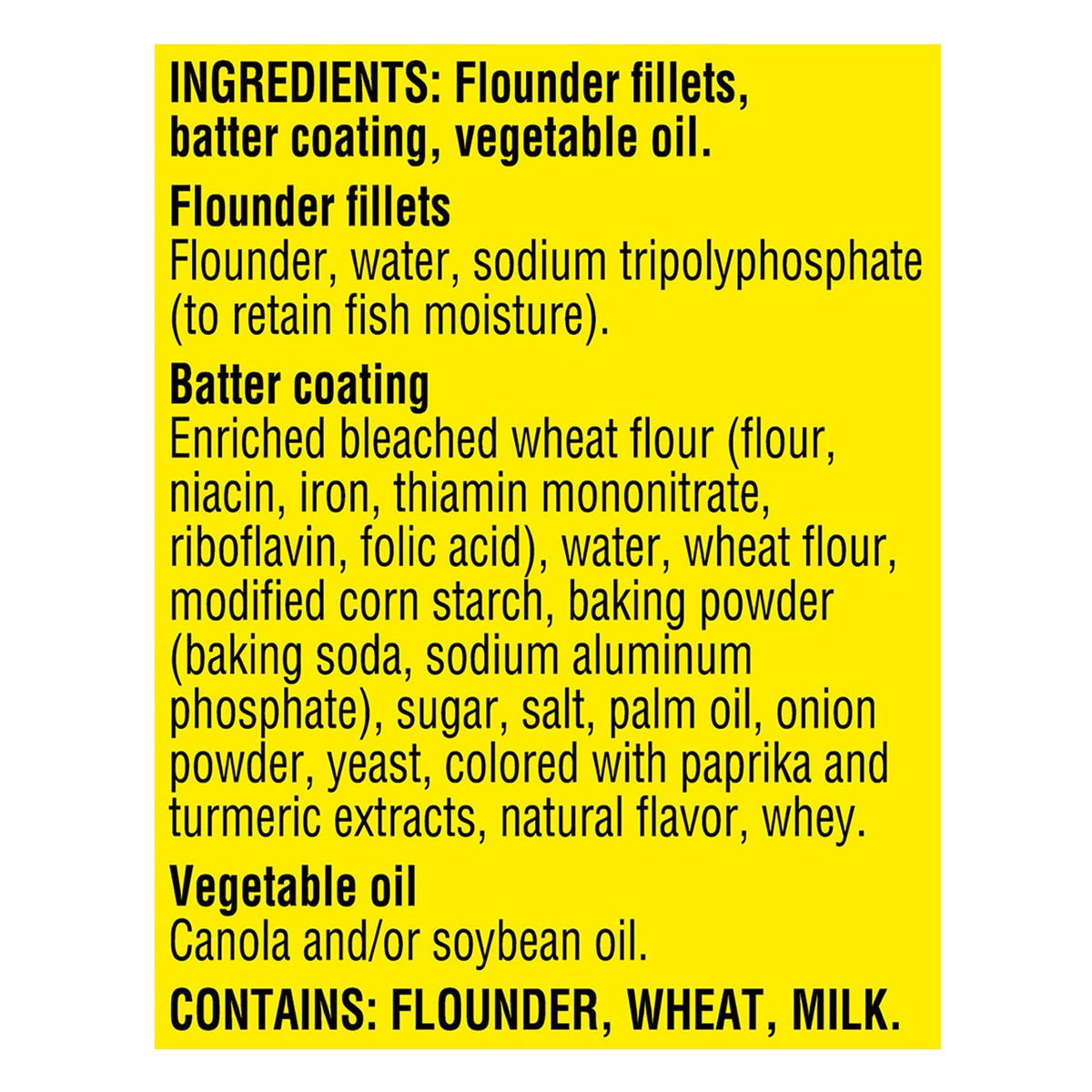 Flounder Fillets, Batter Coating, Vegetable Oil. Flounder Fillets: Flounder, Water, Sodium Tripolyphosphate (to Retain Fish Moisture). Batter Coating: Enriched Bleached Wheat Flour (Flour, Niacin, Iro…