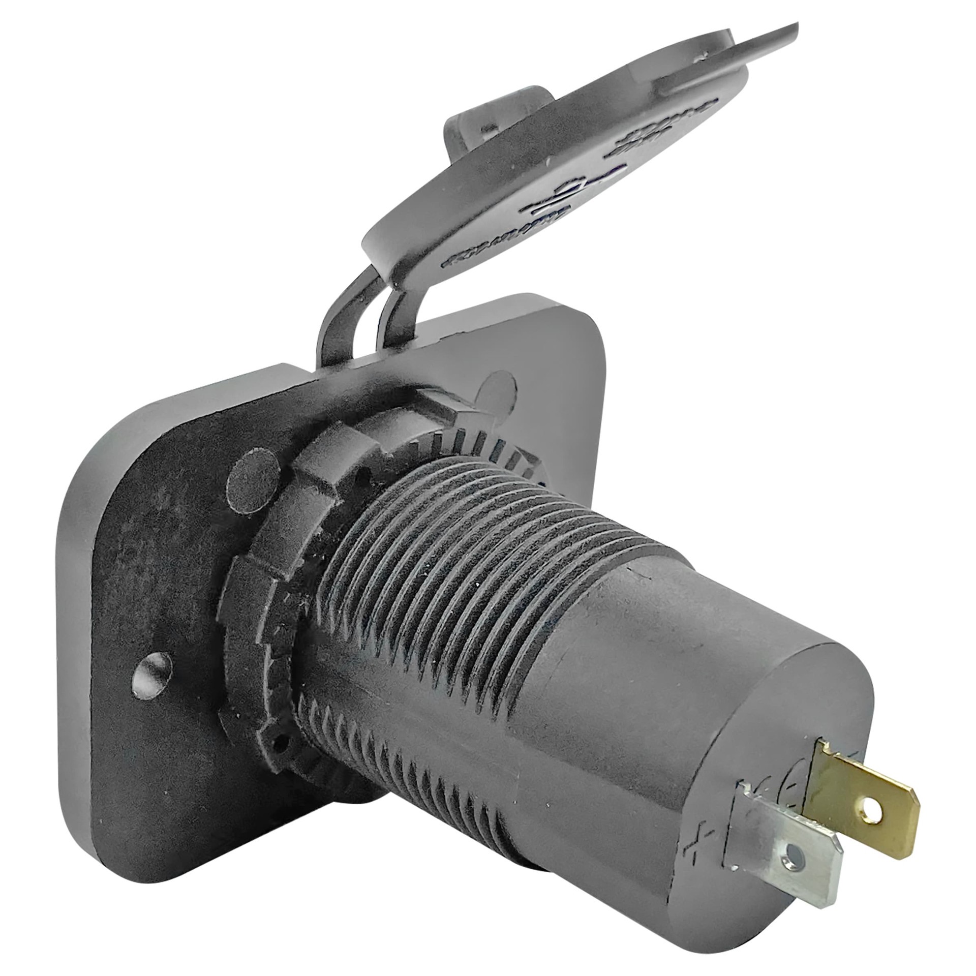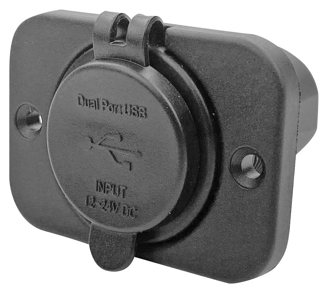 Dual USB Socket - 1 USB & 1 USB "C" Female Socket. Fits 1/4" Heat Shrink Spade Connectors. Stainless Steel Mounting Hardware Included. Tethered Waterproof Cap. 12V DC.