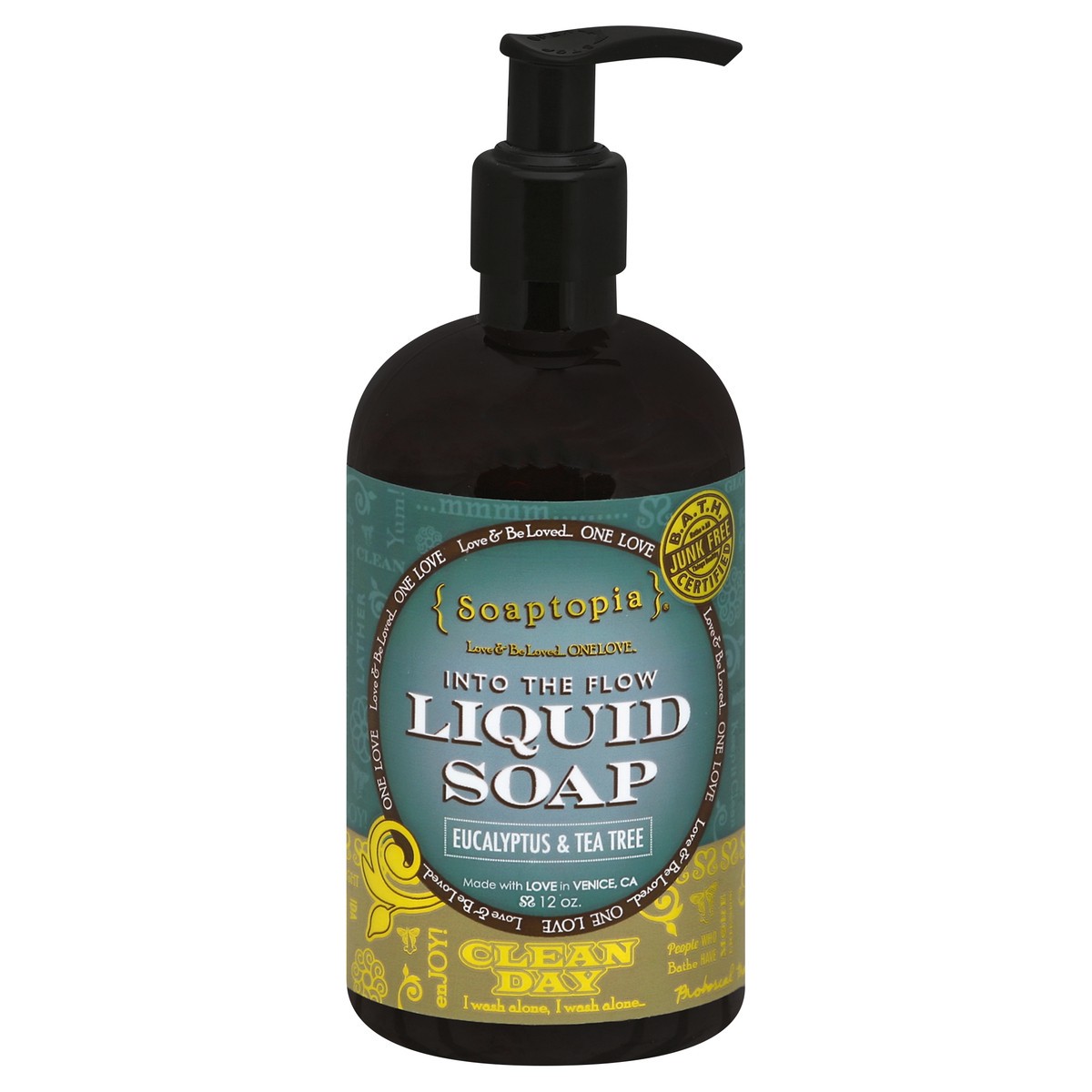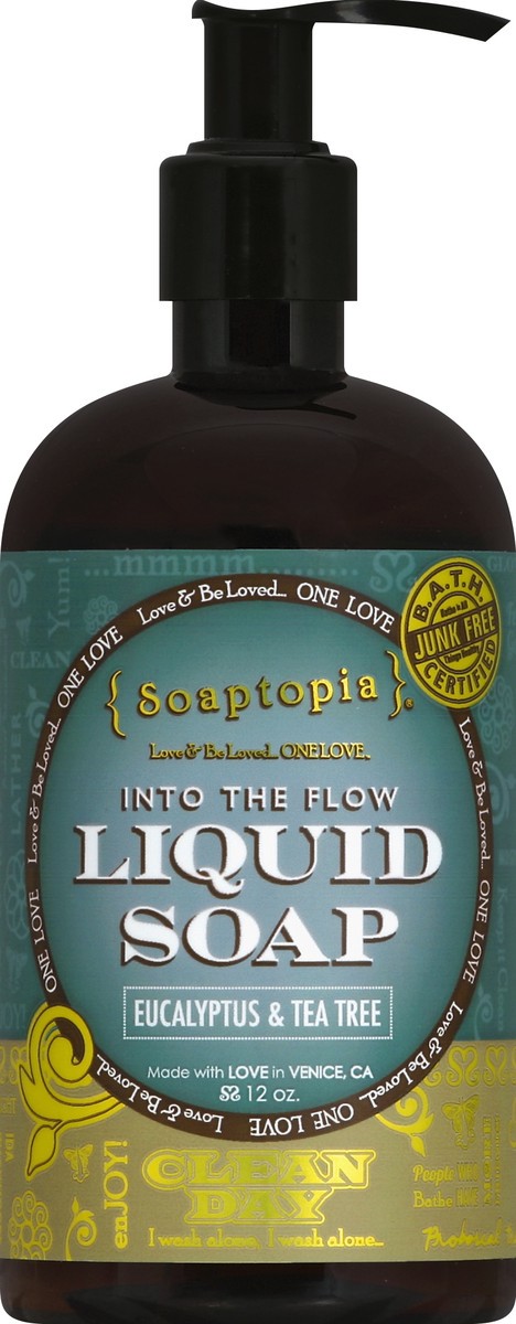 Eucalyptus & tea tree. Love & be loved - one love. B.A.T.H. certified. Bathe to all things healthy. Junk free. Natural botanicals. Pure & mild. Cruelty free. Paraben free. Coconut derived. www.Soaptop…