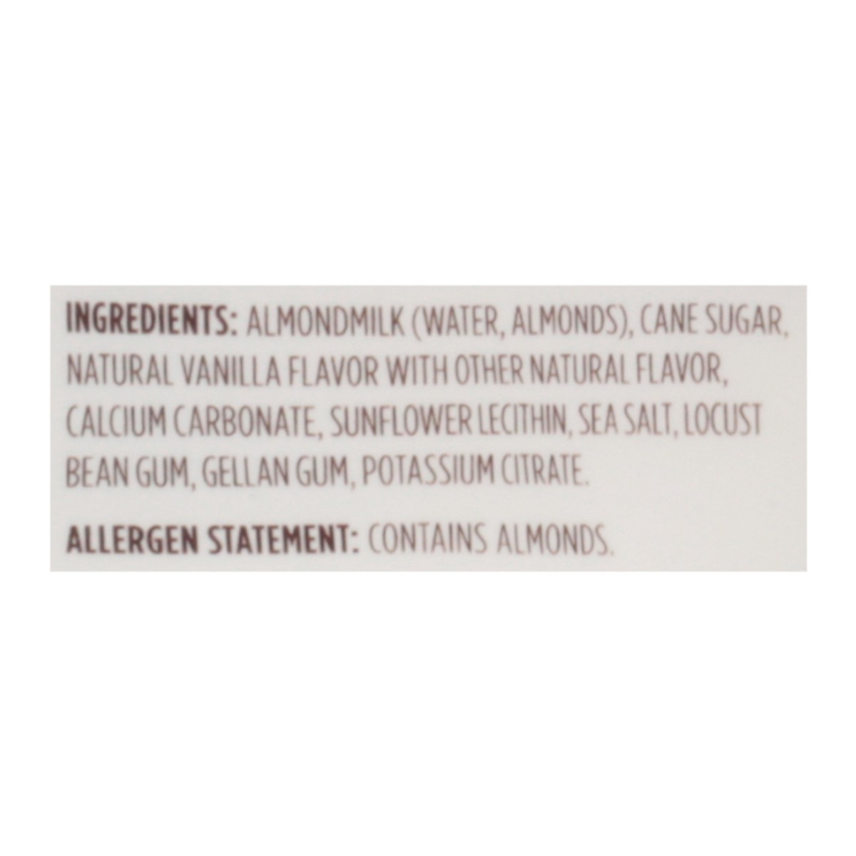 Almondmilk (Water, Almonds), Cane Sugar, Natural Vanilla Flavor with Other Natural Flavor, Calcium Carbonate, Sunflower Lecithin, Sea Salt, Locust Bean Gum, Gellan Gum, Potassium Citrate.