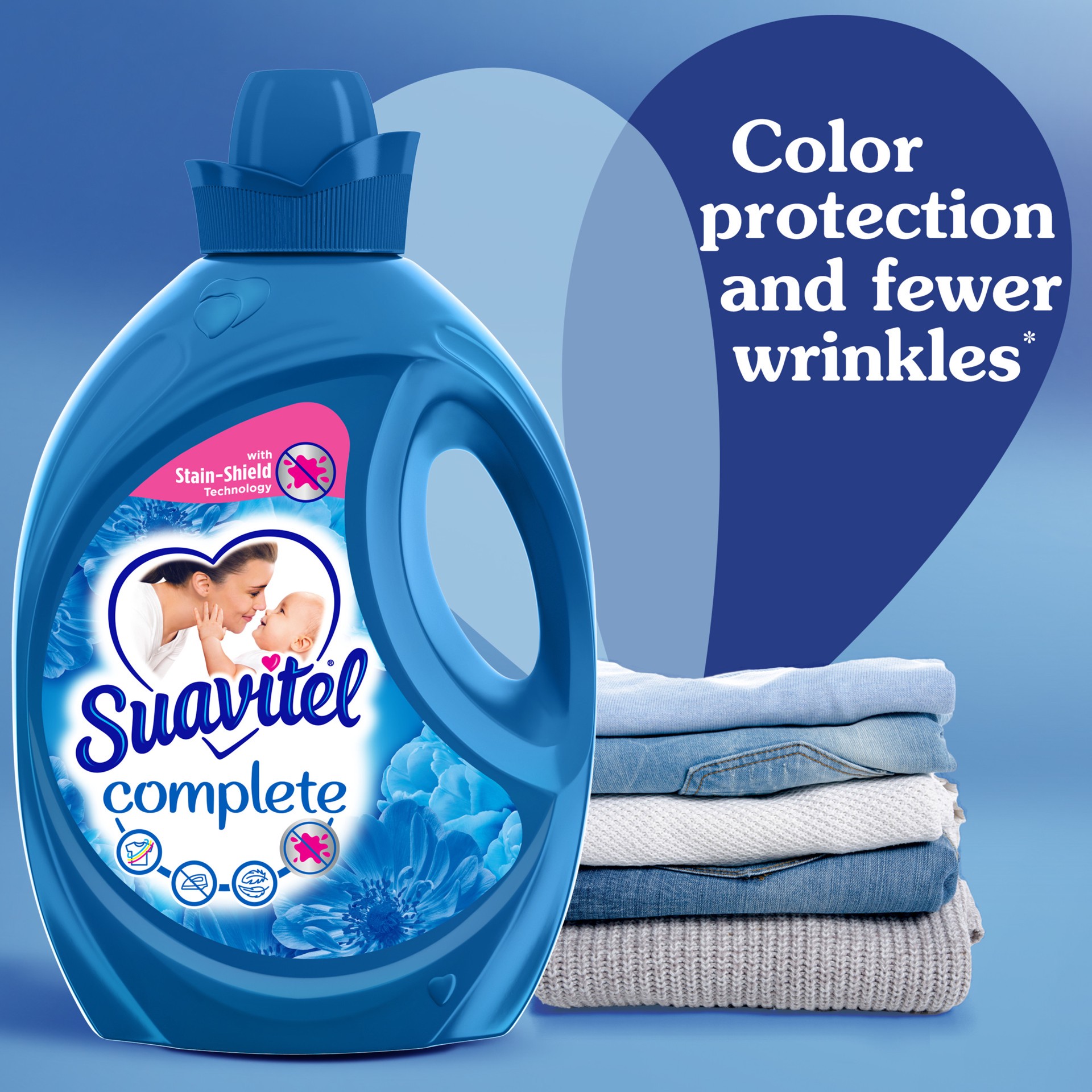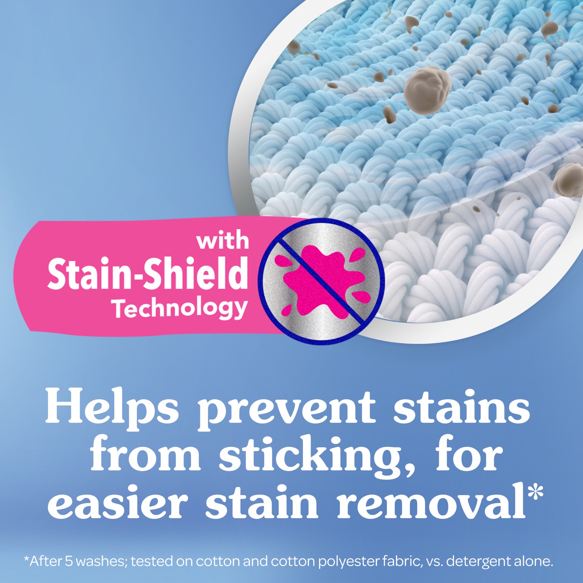 With stain-shield technology. Color protection (After 5 washes; tested on cotton and cotton polyester fabric; vs. detergent alone). Fewer wrinkles (After 5 washes; tested on cotton and cotton polyeste…
