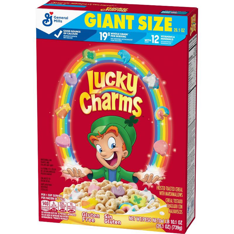 - CONTAINS: One cardboard box of crunchy Lucky Charms Gluten Free Cereal with Marshmallows, Kids Breakfast Cereal, Giant Size, 26.1 oz; Perfect for instant snacking, or a part of breakfast and meals