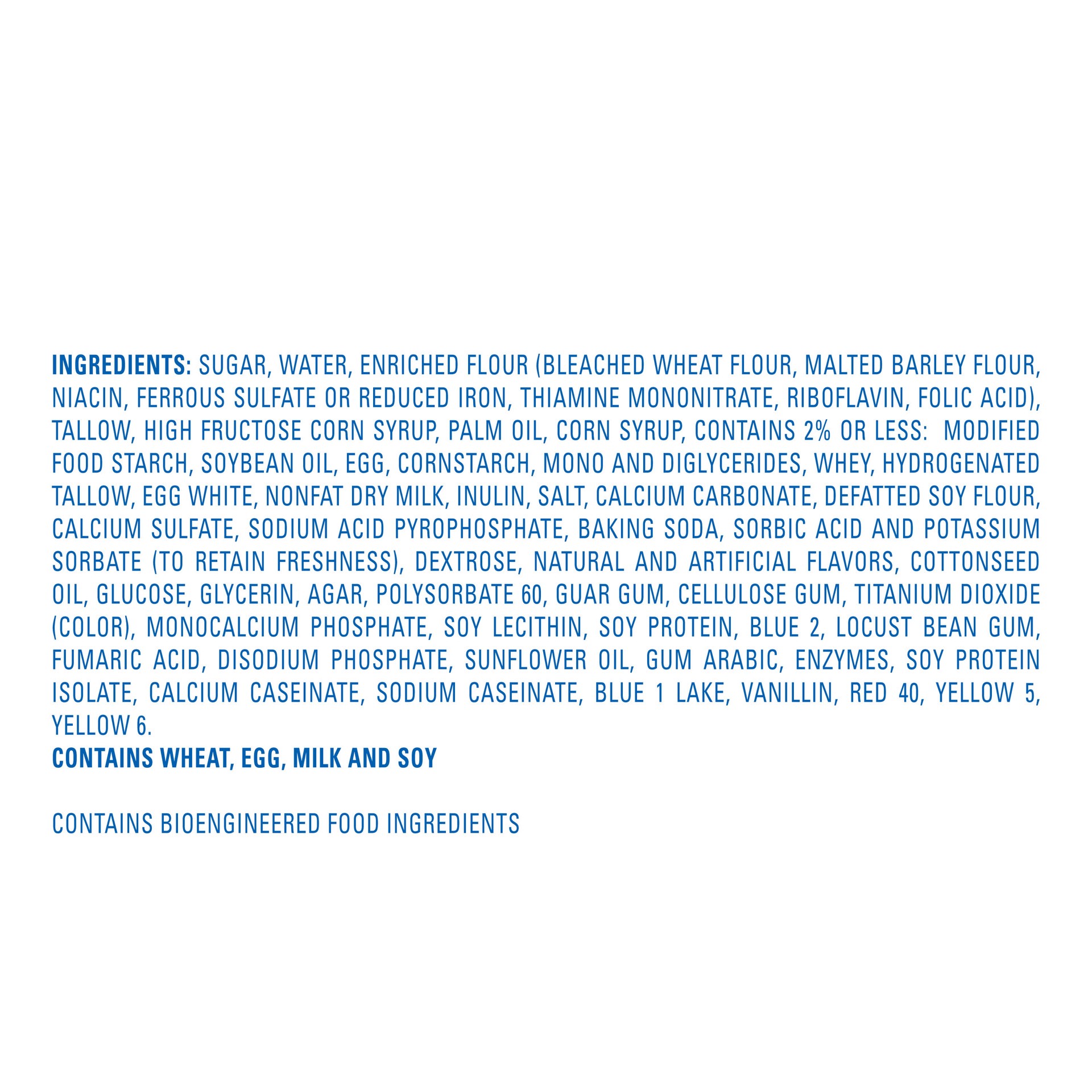Sugar, Water, Enriched Flour (Bleached Wheat Flour, Malted Barley Flour, Niacin, Ferrous Sulfate Or Reduced Iron, Thiamine Mononitrate, Riboflavin, Folic Acid), Tallow, High Fructose Corn Syrup, Palm …