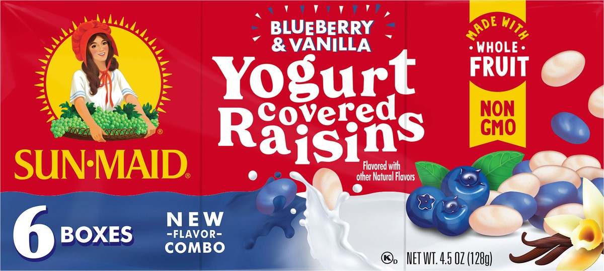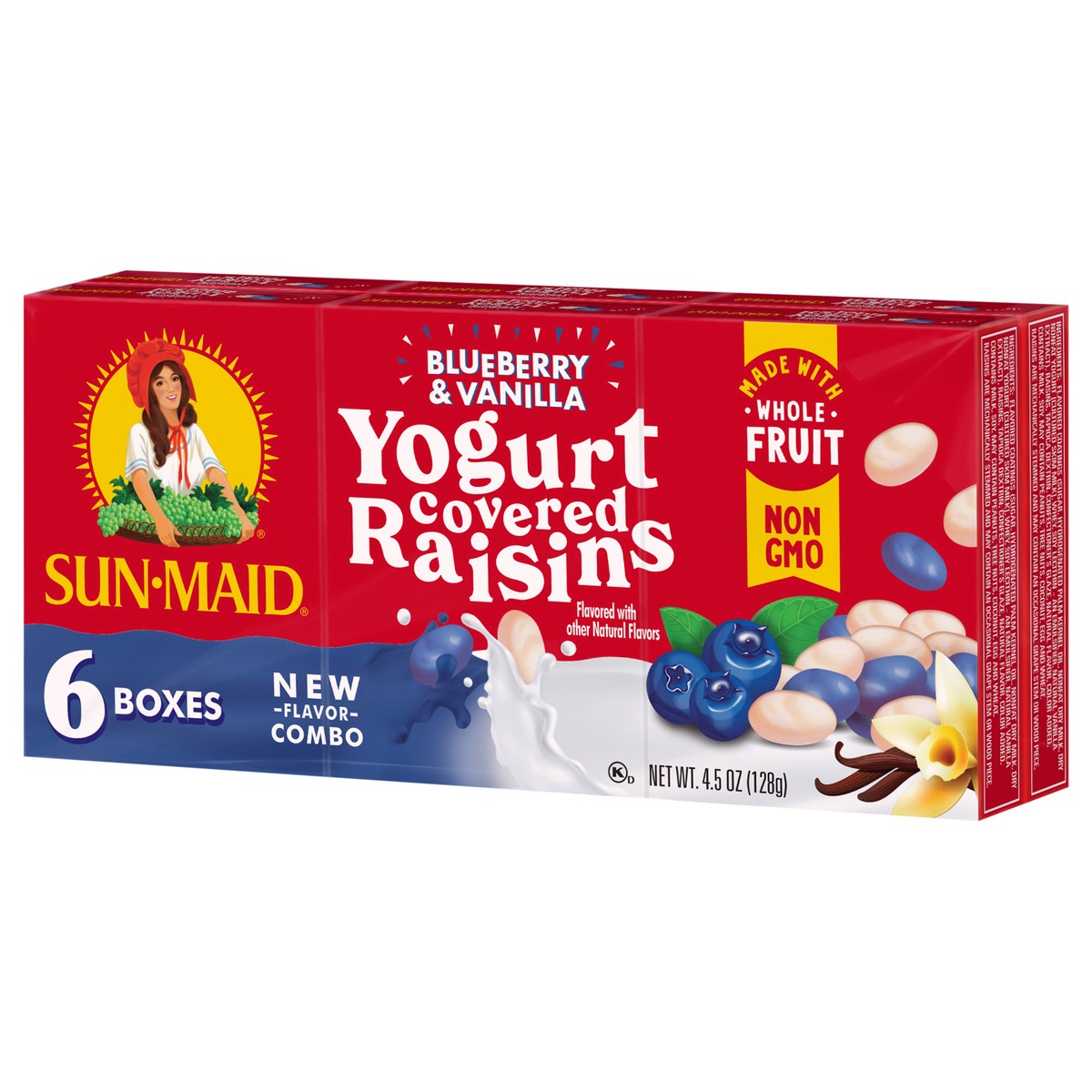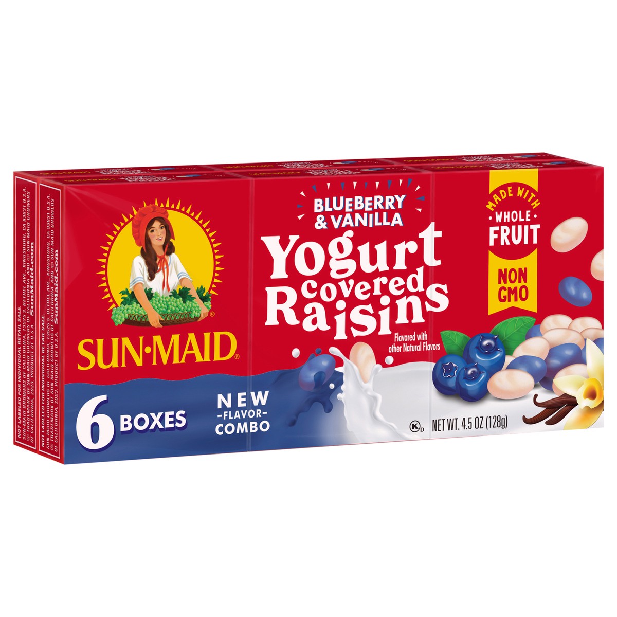 Sun-Maid Blueberry & Vanilla Yogurt Covered Raisins - Kids crave, moms approve, made with whole fruit. Sun-Maid’s timeless and trusted raisins wrapped in blueberry & vanilla yogurt. A better for you, …