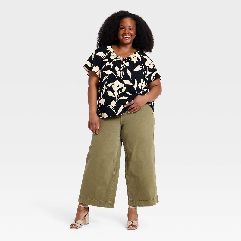 Women's Flutter Short Sleeve V-Neck Tie-Front Blouse - Ava & Viv™ Black/Cream Floral 1X