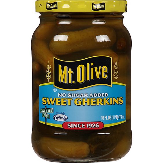 Mt. Olive Sweet Gherkin No Sugar Added pickles feature the old fashioned sweet pickle flavor that you have always loved without the additional calories from added sugar. Both salty and sweet, Mt. Oliv…
