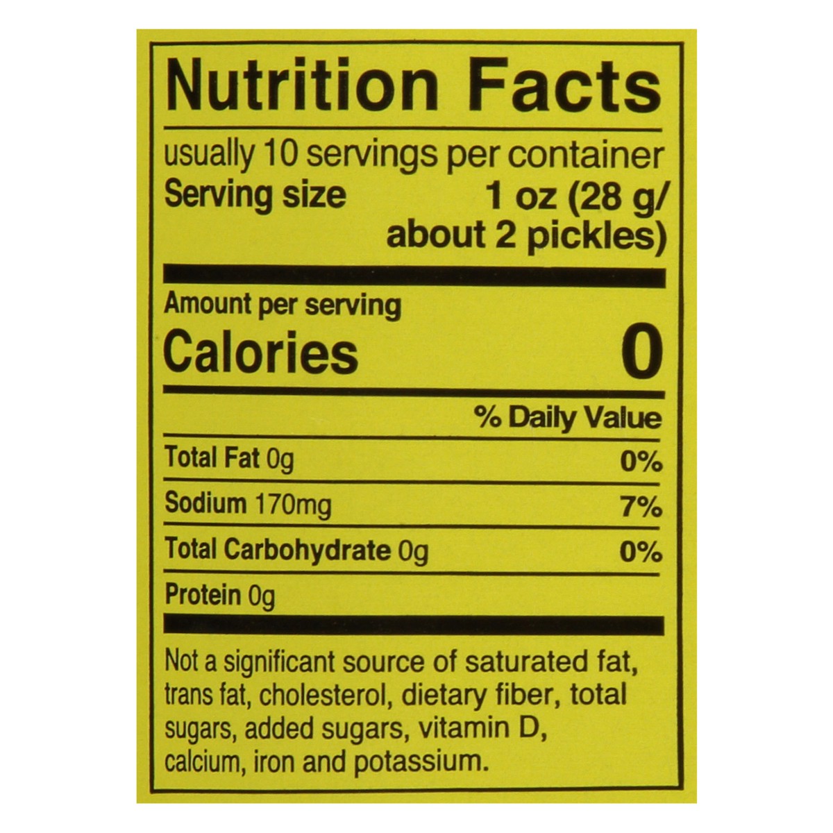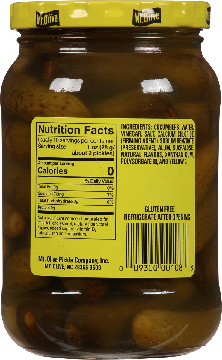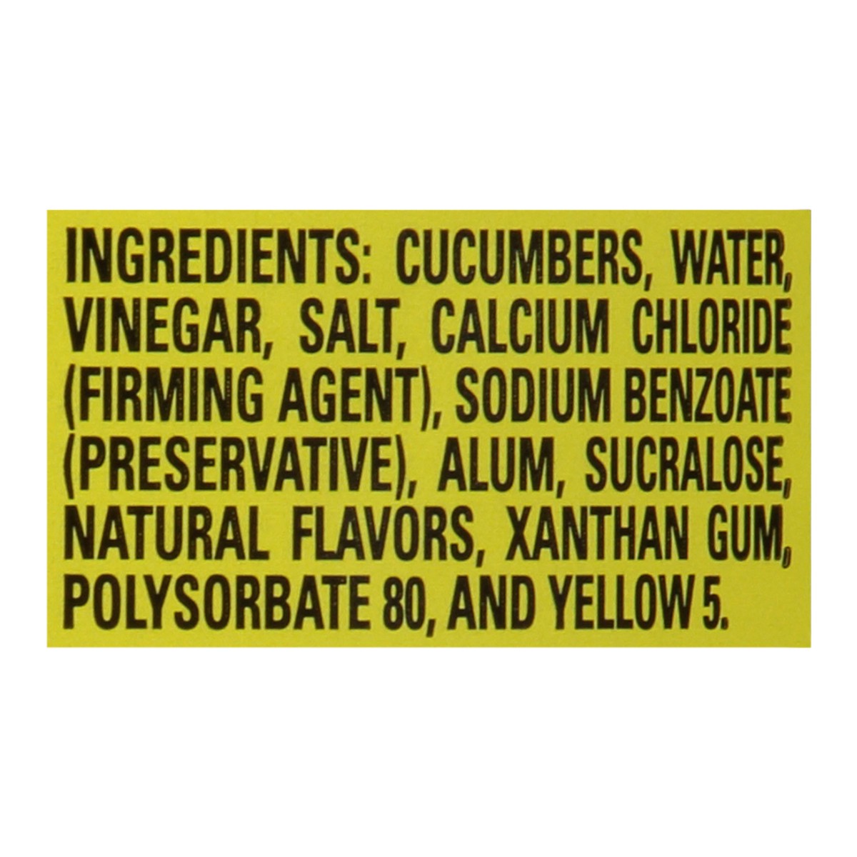 Cucumbers, Water, Vinegar, Salt, Calcium Chloride (Firming Agent), Sodium Benzoate (Preservative), Alum, Sucralose, Natural Flavors, Xanthan Gum, Polysorbate 80, and Yellow 5.