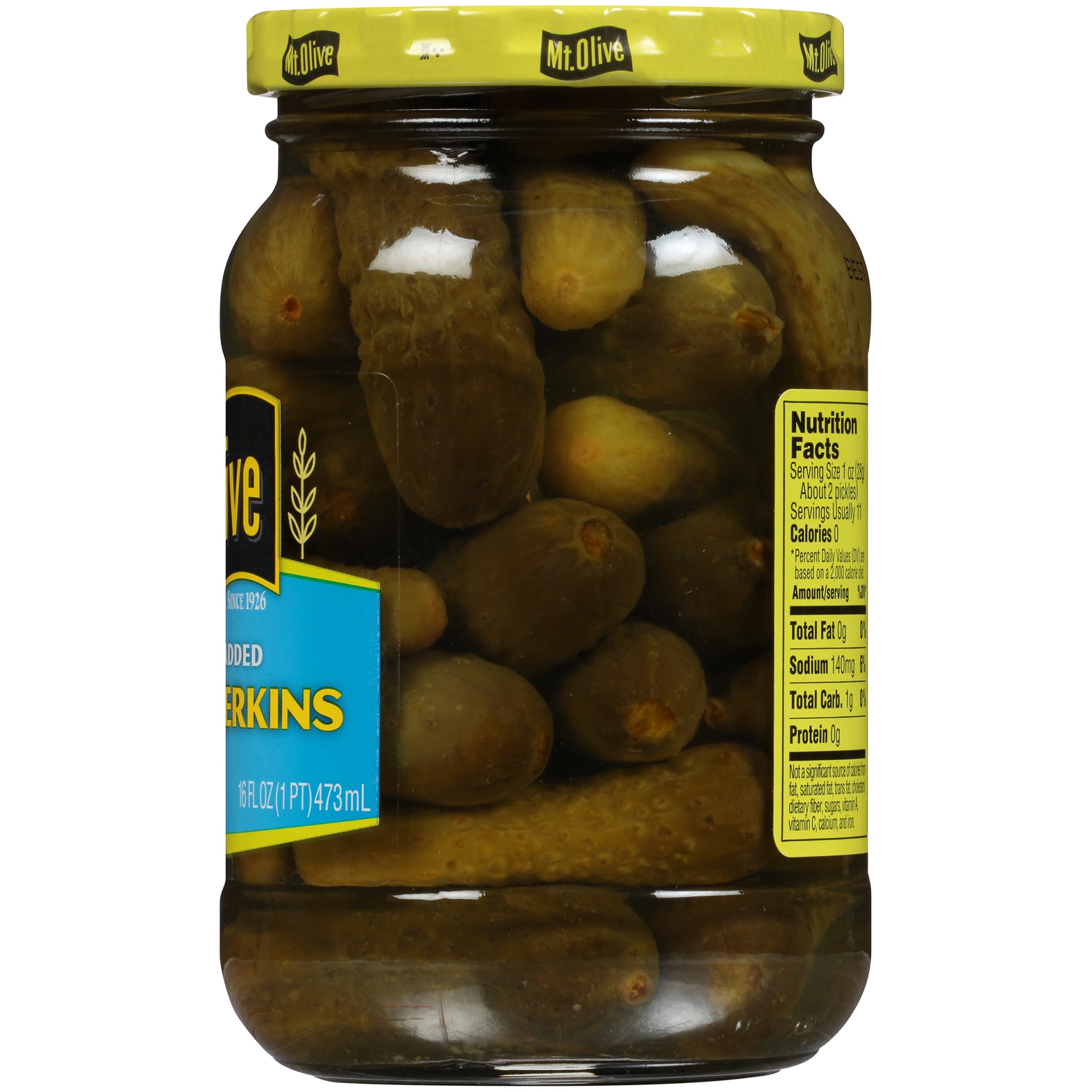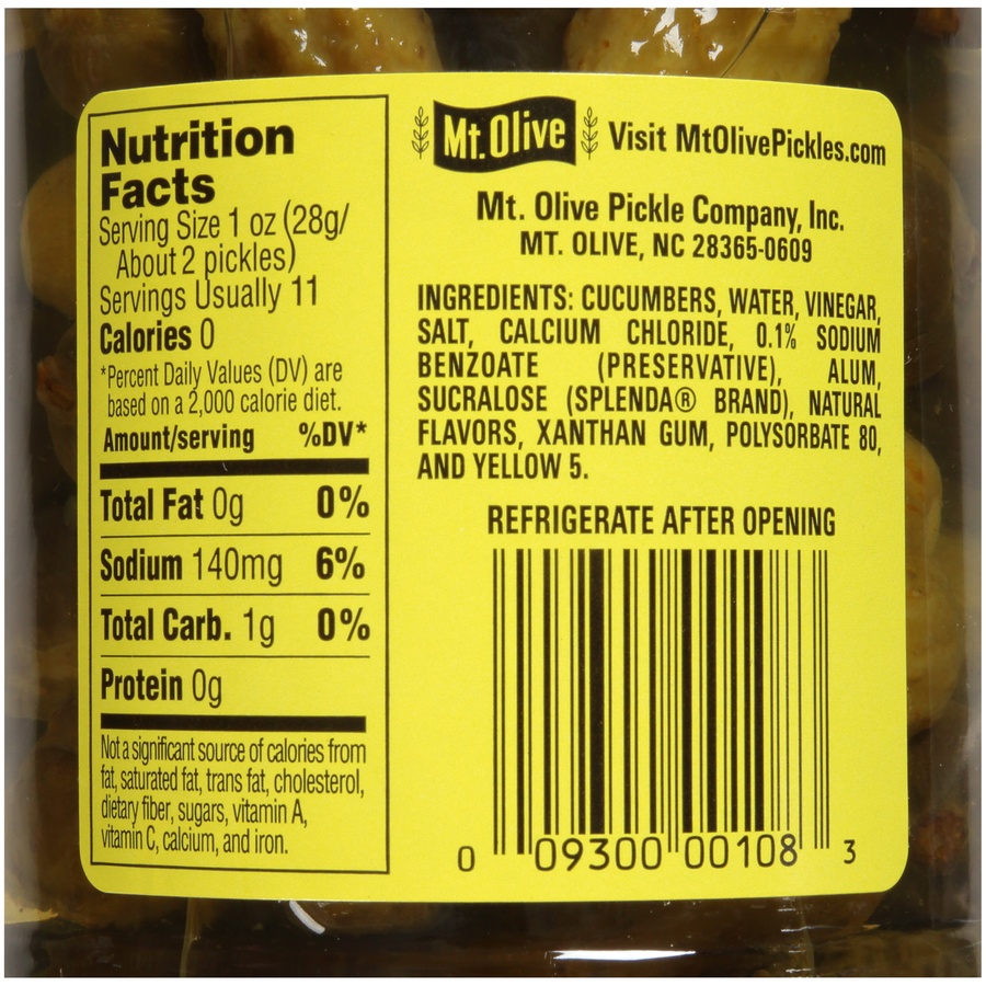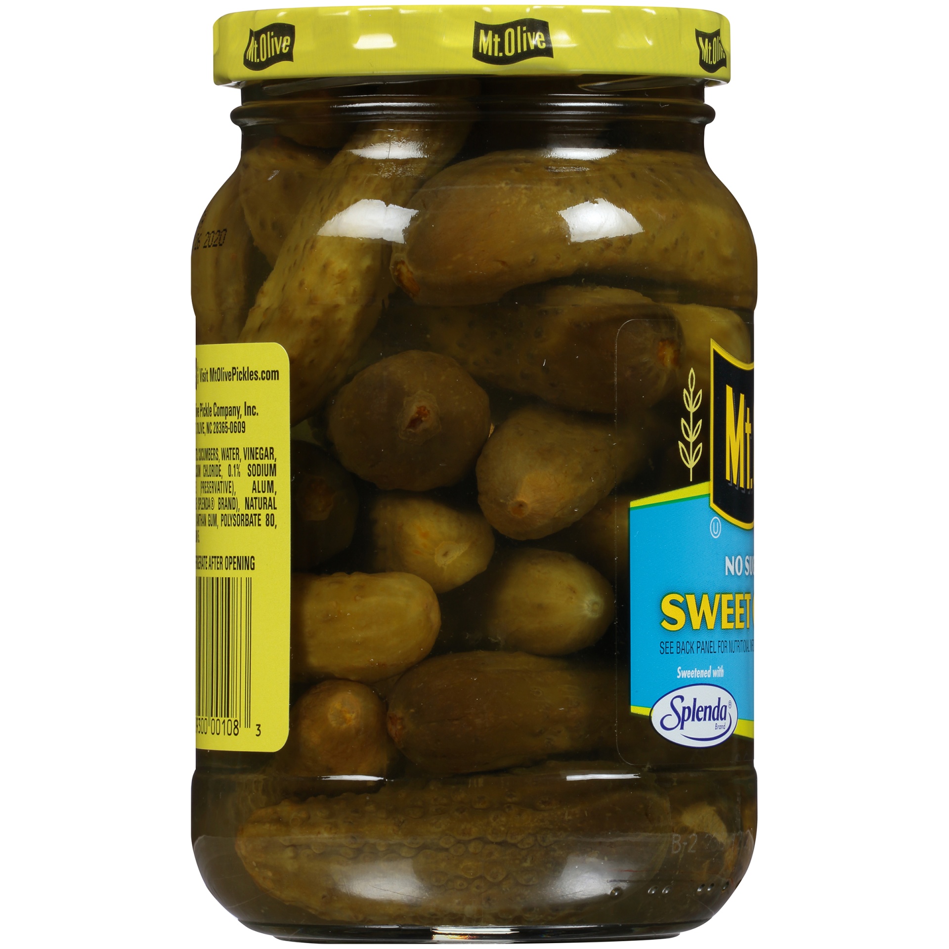 Mt. Olive Sweet Gherkin No Sugar Added pickles feature the old fashioned sweet pickle flavor that you have always loved without the additional calories from added sugar. Both salty and sweet, Mt. Oliv…