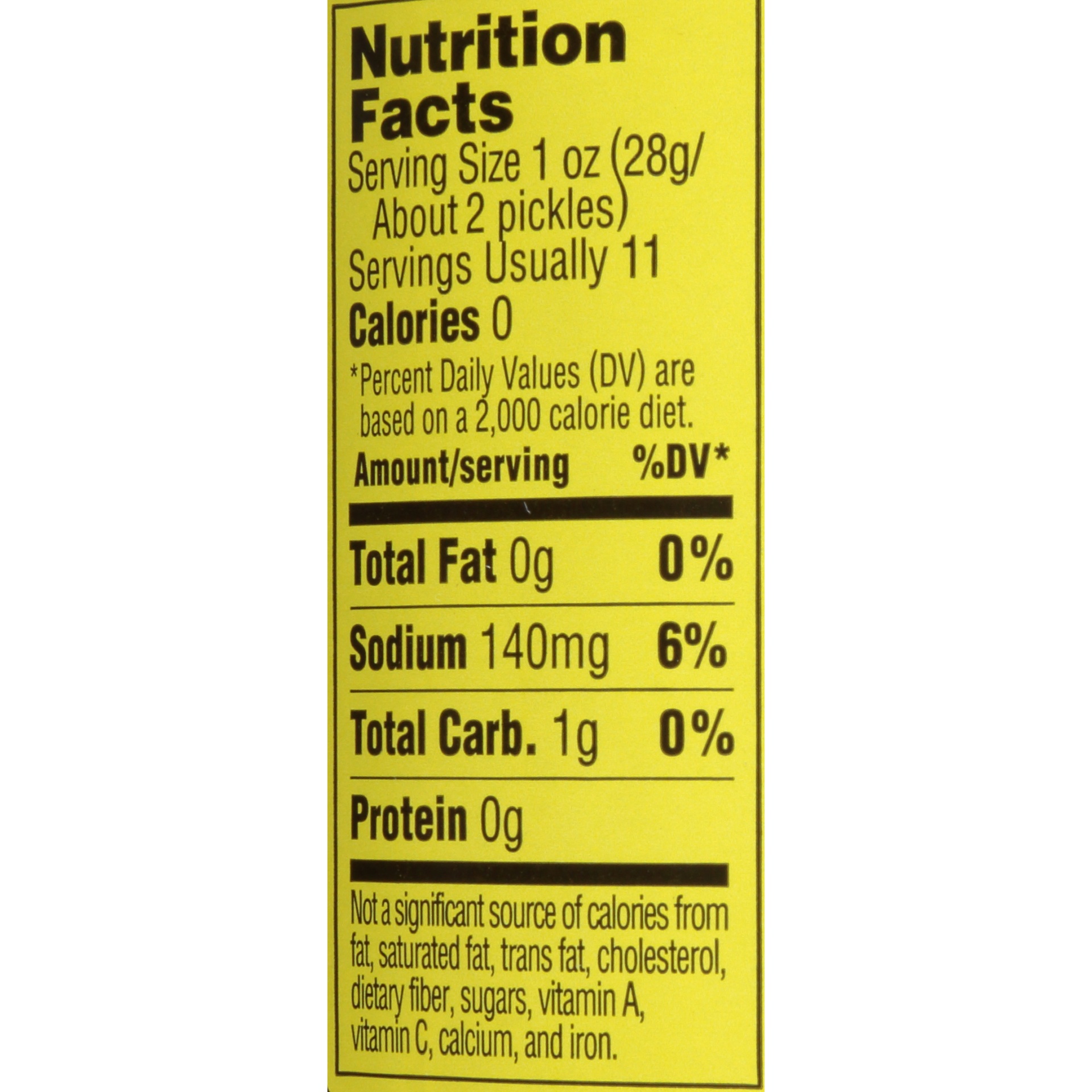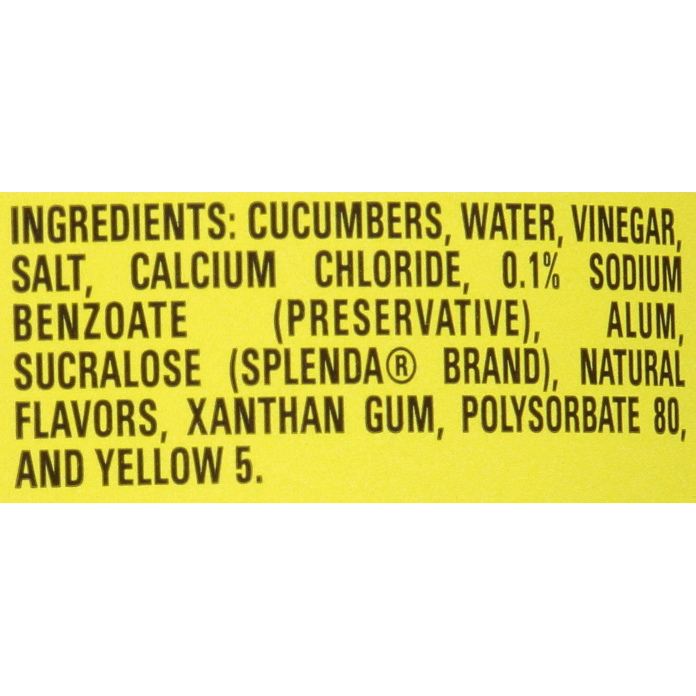 Cucumbers, Water, Vinegar, Salt, Calcium Chloride (Firming Agent), Sodium Benzoate (Preservative), Alum, Sucralose, Natural Flavors, Xanthan Gum, Polysorbate 80, and Yellow 5.