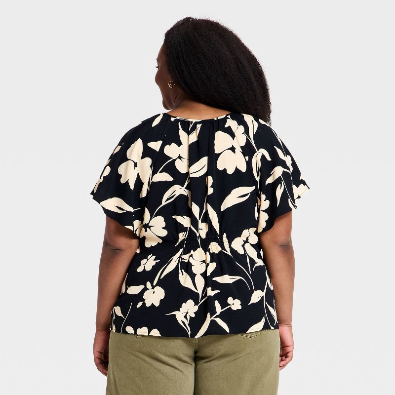 Women's Flutter Short Sleeve V-Neck Tie-Front Blouse - Ava & Viv™ Black/Cream Floral 3X