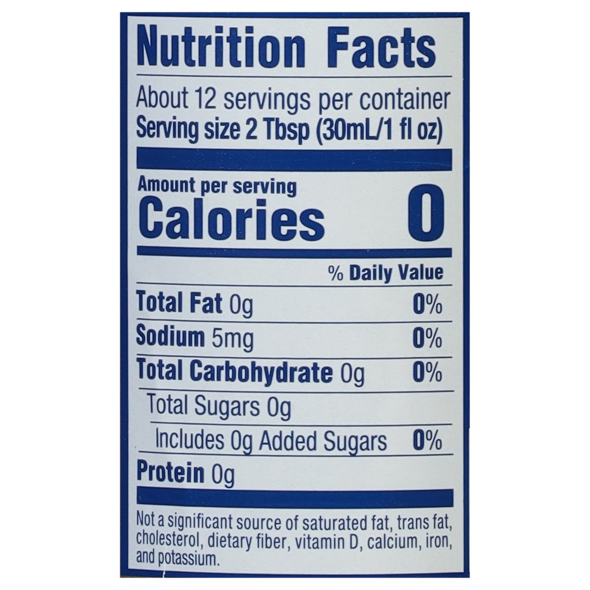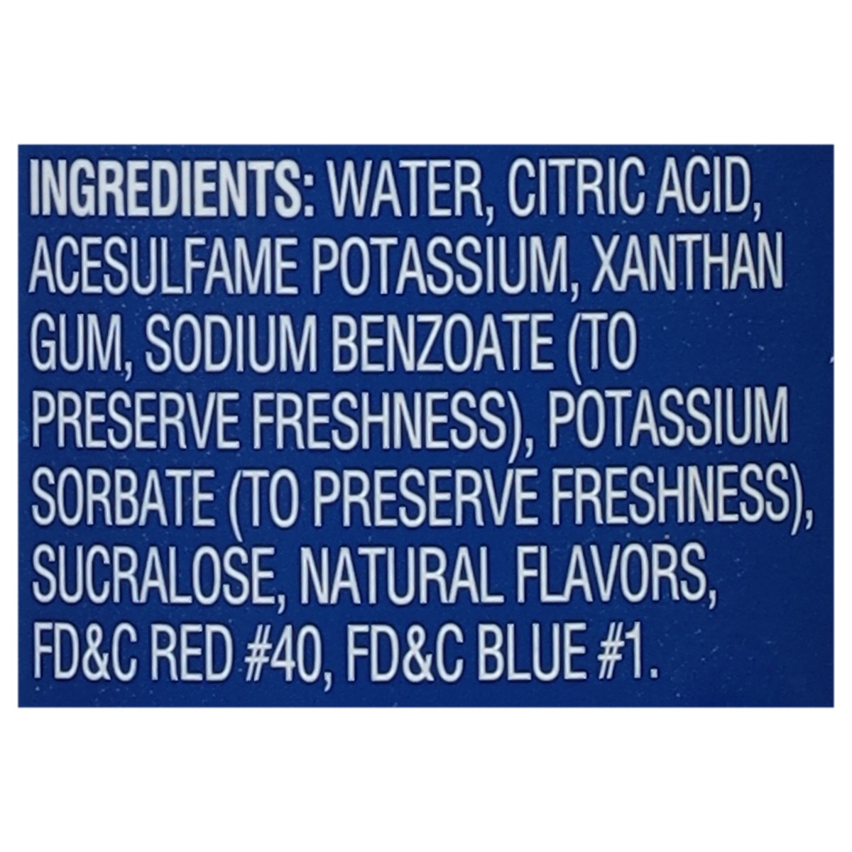 Water, Citric Acid, Acesulfame Potassium, Xanthan Gum, Sodium Benzoate (to Preserve Freshness), Potassium Sorbate (to Preserve Freshness), Sucralose, Natural Flavors, FD&C Red 40, FD&C Blue 1.