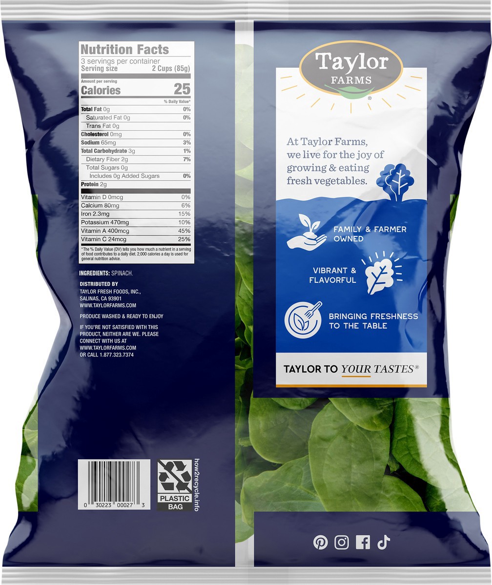 Taylor Farms Spinach is sustainably grown, nutrient-rich, thoroughly washed, and ready to eat right out of the bag. These tender spinach leaves are fat-free and low in calories. While spinach is a gre…