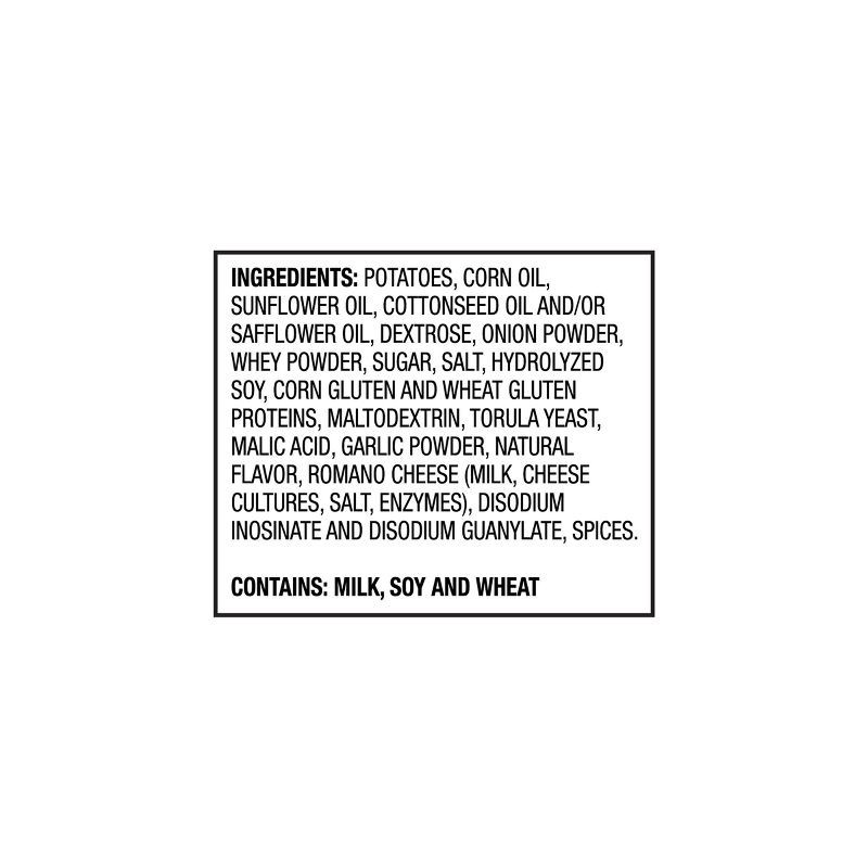 Potatoes, Vegetable Oil (Contains One or More of the Following: Corn Oil, Sunflower Oil, Cottonseed Oil, Canola Oil and/or Safflower Oil), Dextrose, Sugar, Onion Powder, Salt, Whey Powder, Maltodextri…