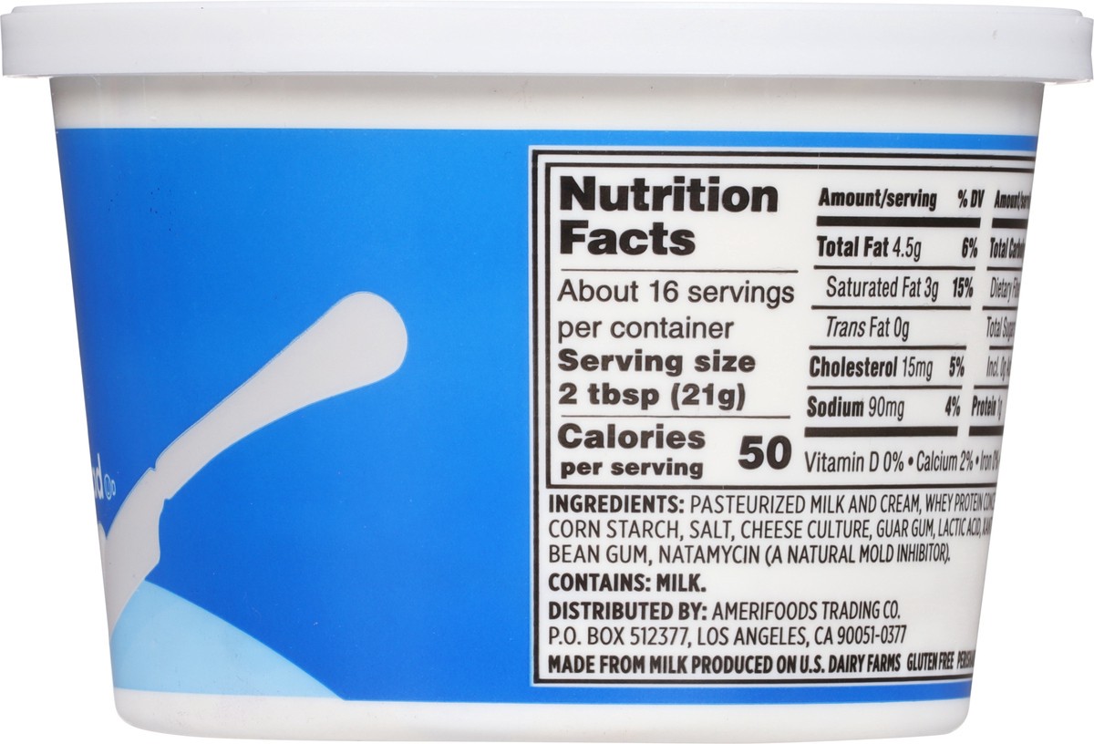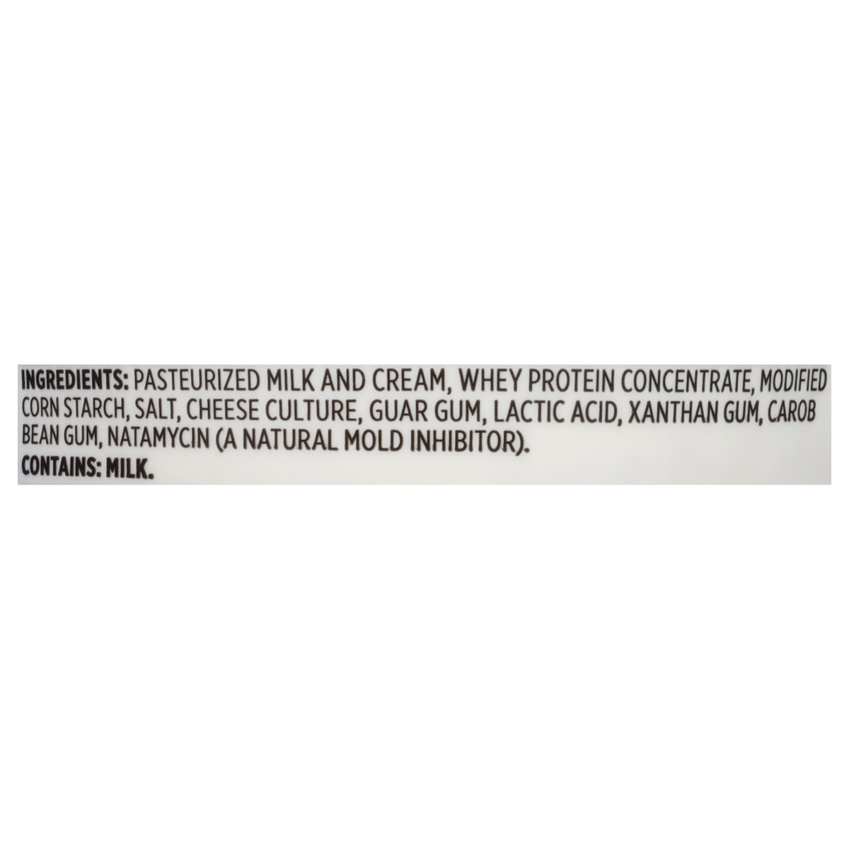Pasteurized Milk and Cream, Whey Protein Concentrate, Modified Corn Starch, Salt, Cheese Culture, Guar Gum, Lactic Acid, Xanthan Gum, Carob Bean Gum, Natamycin (a Natural Mold Inhibitor).
