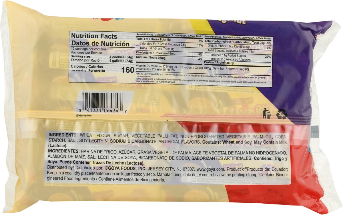 Coconut flavored cream sandwich cookies. Contains bioengineered food ingredients. 12 packs x 4 cookies. www.goya.com. Dispose of properly.