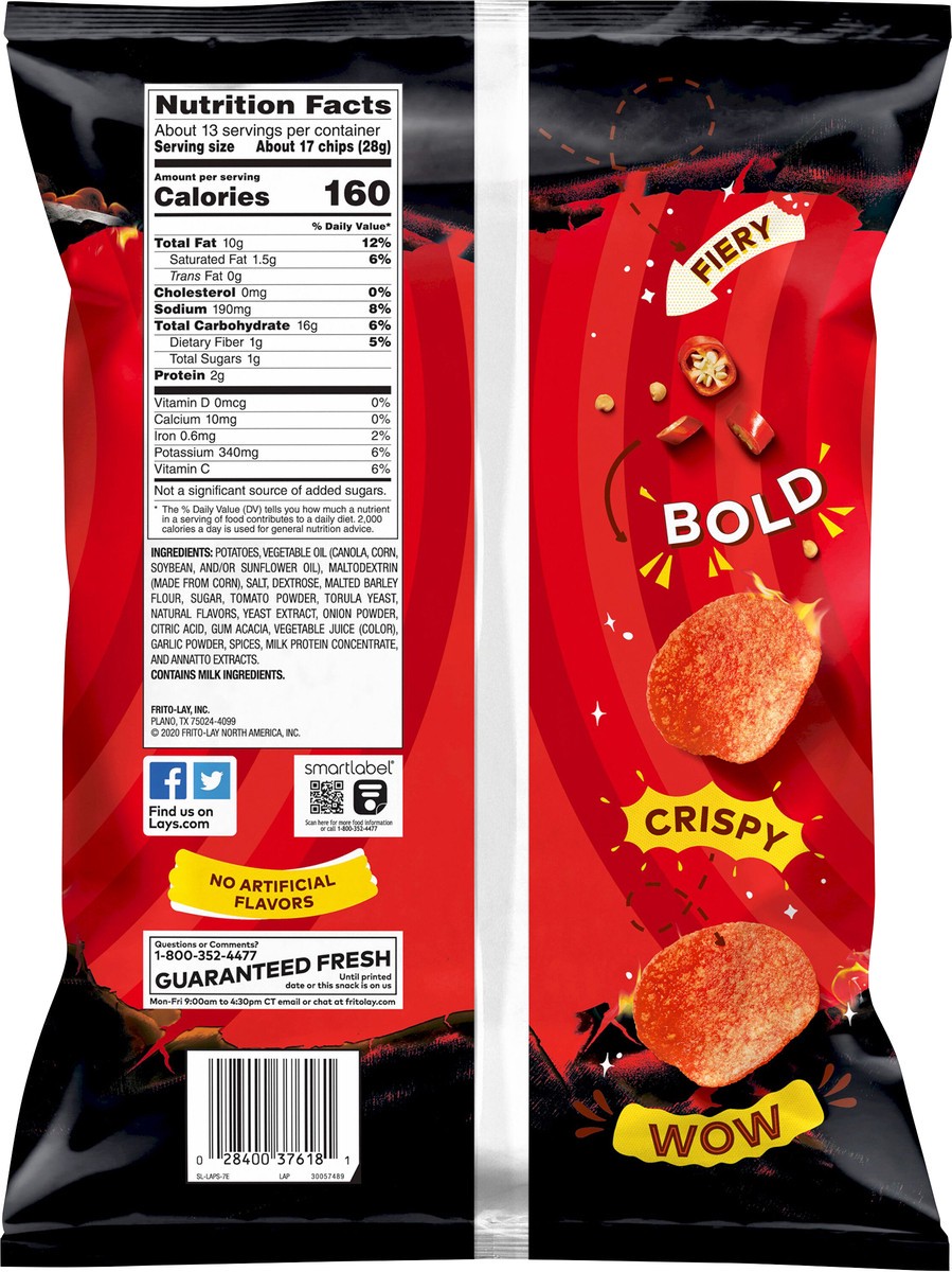 No artificial flavors. Now even hotter compare to previous recipe. Fiery. Bold. Crispy. Wow. fritolay.com; Lays.com. Facebook, Twitter. Find us on lays.com. Smartlabel: Scan for more food information,…