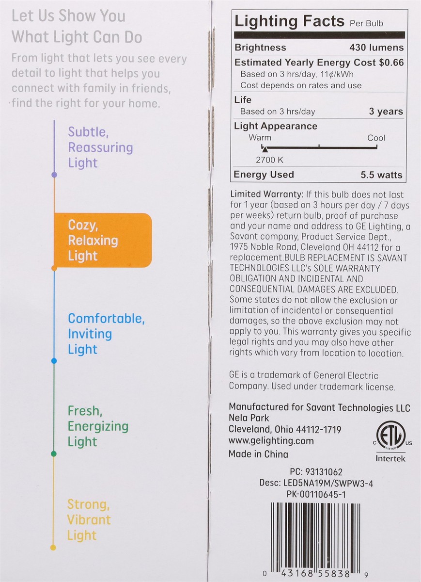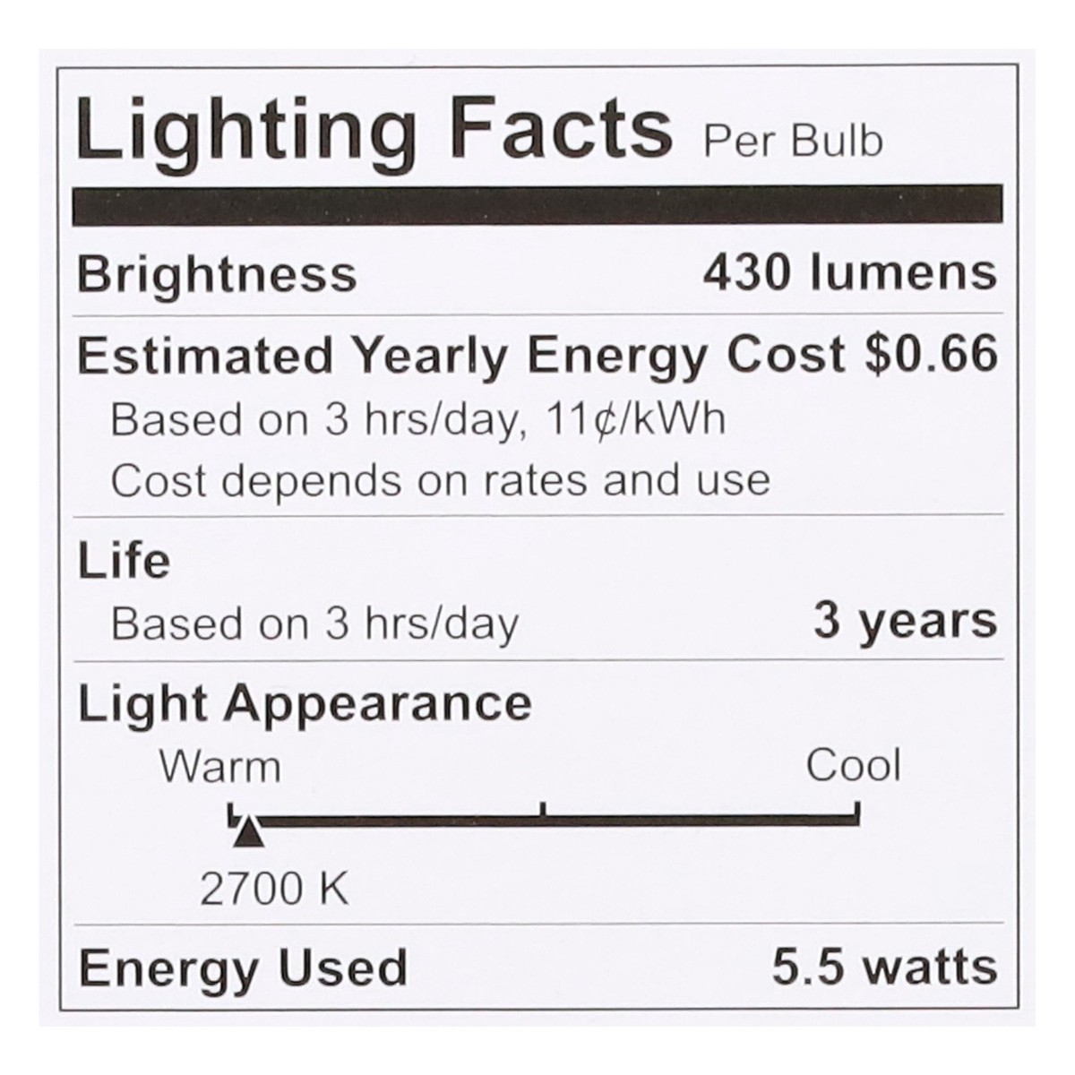 Brightness Quantity: 430 lumens. Energy Info: $0.66 Based on 3 hrs/day, 11 cents/kWh Cost depends on rates and use 5.5 watts. Package Info: 4-Pack. 4. Bulb Info: Both. LED. Bulb Life: 3 years Based on…