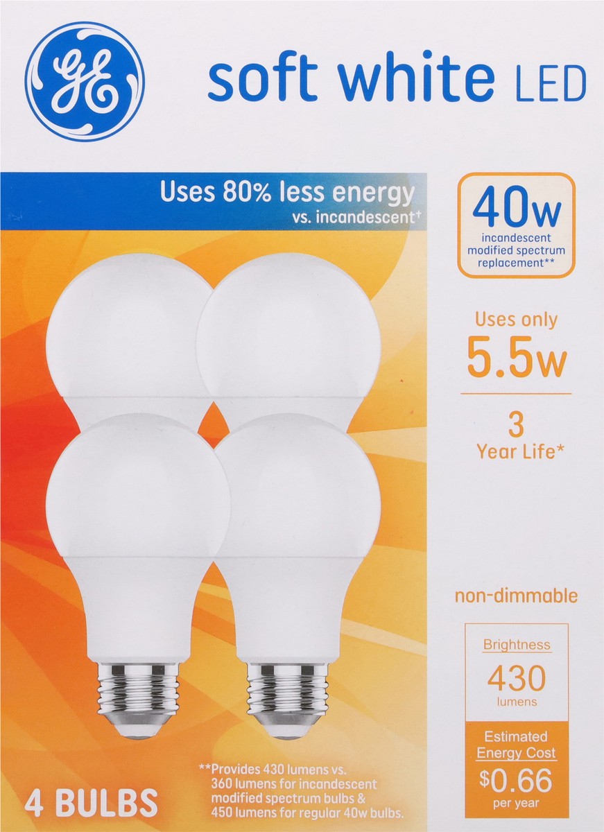 Brightness Quantity: 430 lumens. Energy Info: $0.66 Based on 3 hrs/day, 11 cents/kWh Cost depends on rates and use 5.5 watts. Package Info: 4-Pack. 4. Bulb Info: Both. LED. Bulb Life: 3 years Based on…