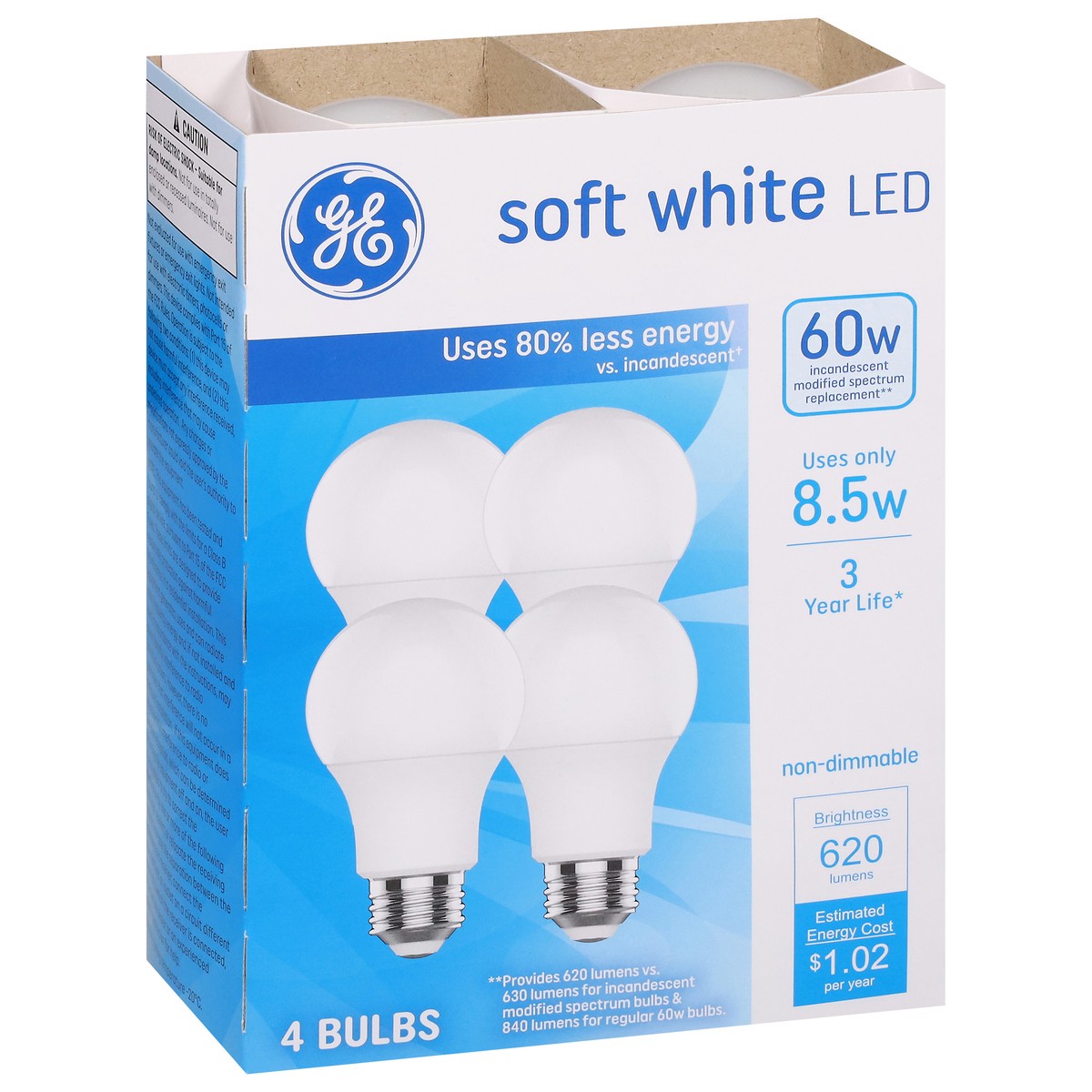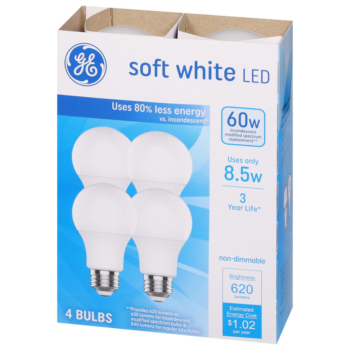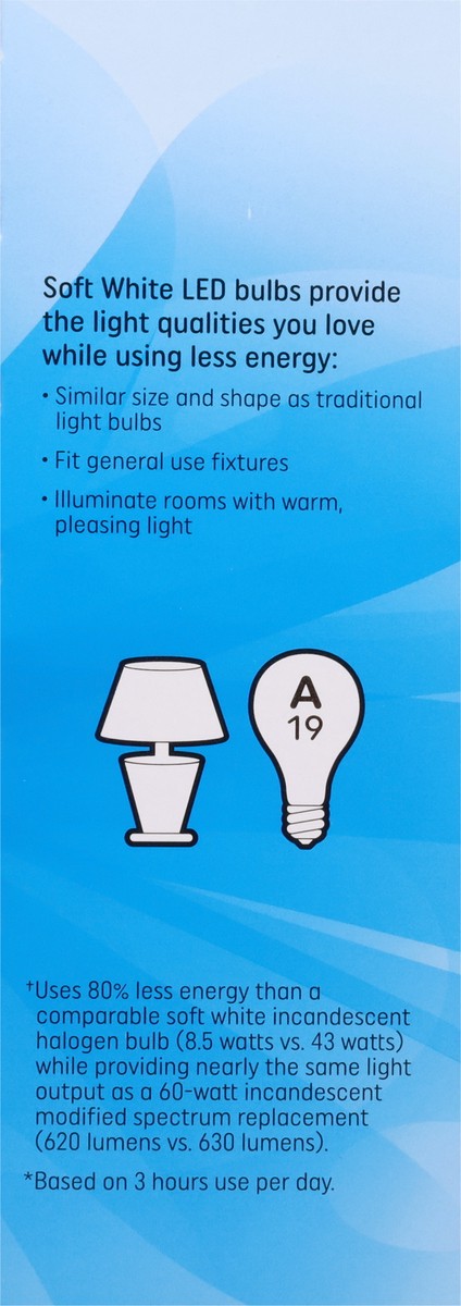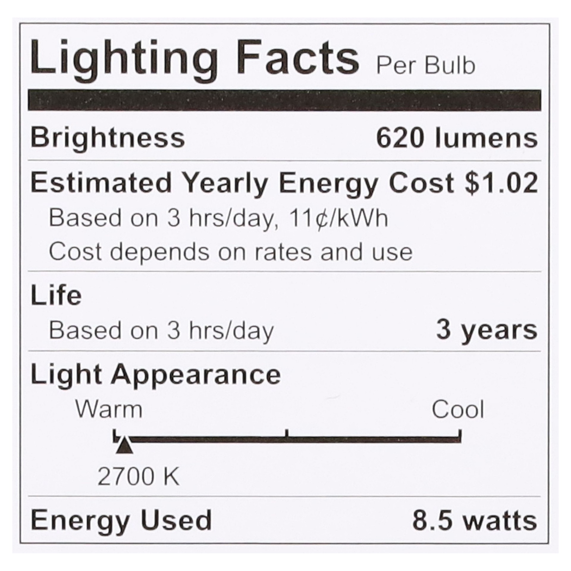 Energy Info: Based on 3 hrs/day, 11 cent/kwh cost depends on rates and use 8.5 watts. Package Info: 4-Pack. 4. Voltage: 60 watts. Bulb Info: Both. LED. Screw. Bulb Life: 3 years Based on 3 hrs/day Bul…