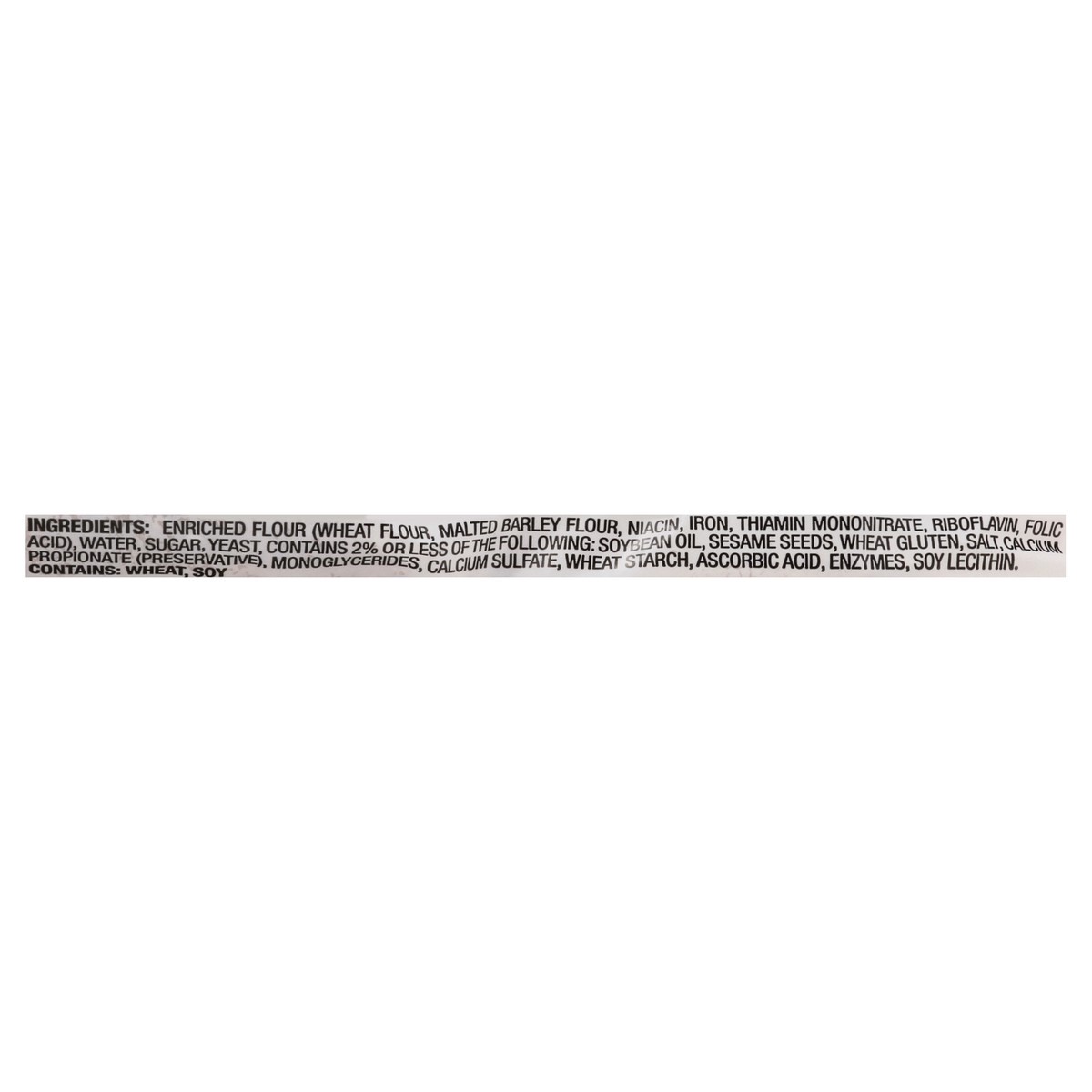 Enriched Flour (Wheat Flour, Malted Barley Flour, Niacin, Iron, Thiamin Mononitrate, Riboflavin, Folic Acid), Water, Sugar, Yeast, Contains 2% or Less of the Following: Soybean Oil, Sesame Seeds, Whea…
