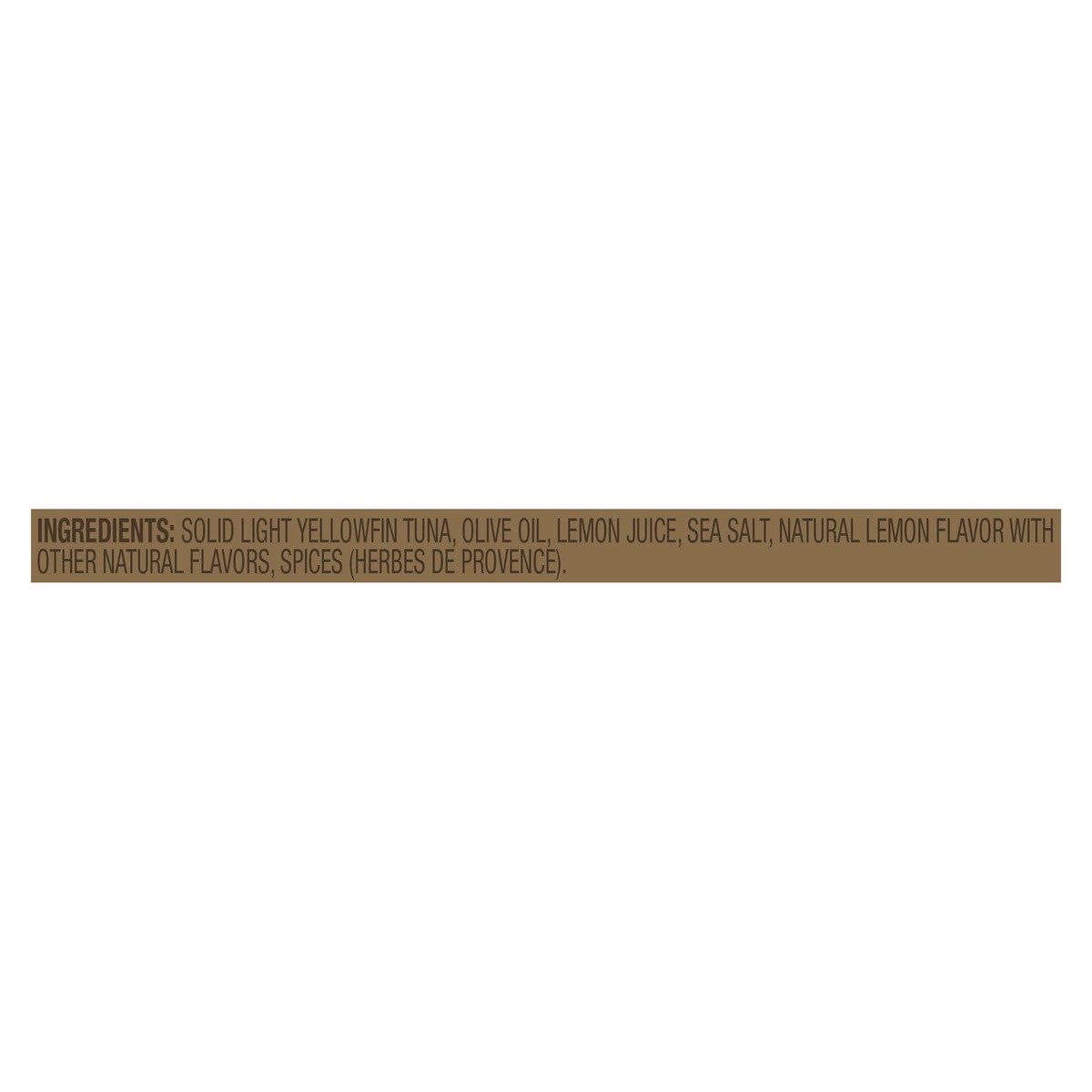 Solid Light Yellowfin Tuna, Olive Oil, Lemon Juice, Sea Salt, Natural Lemon Flavor with Other Natural Flavors, Spices (Herbes De Provence).