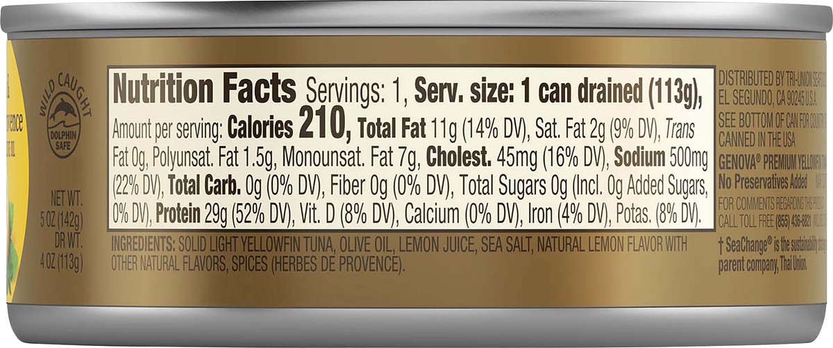 Solid Light Yellowfin Tuna, Olive Oil, Lemon Juice, Sea Salt, Natural Lemon Flavor with Other Natural Flavors, Spices (Herbes De Provence).
