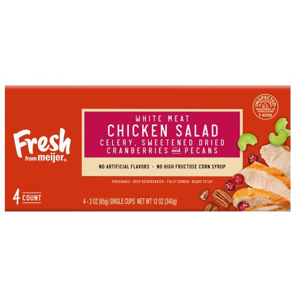 Fresh from Meijer White Meat Chicken Salad offers a delightful mix of shredded chicken, crunchy celery, sweet dried cranberries, and rich pecans. Free from artificial flavors and high fructose corn sy…