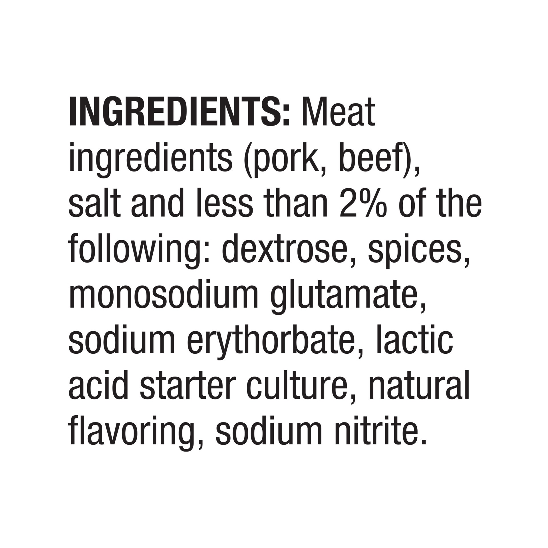 Ingredients: Meat ingredients (pork, beef), salt, and less than 2% of the following: dextrose, spices, monosodium glutamate, sodium erythorbate, lactic acid starter culture, natural flavorings, sodium…