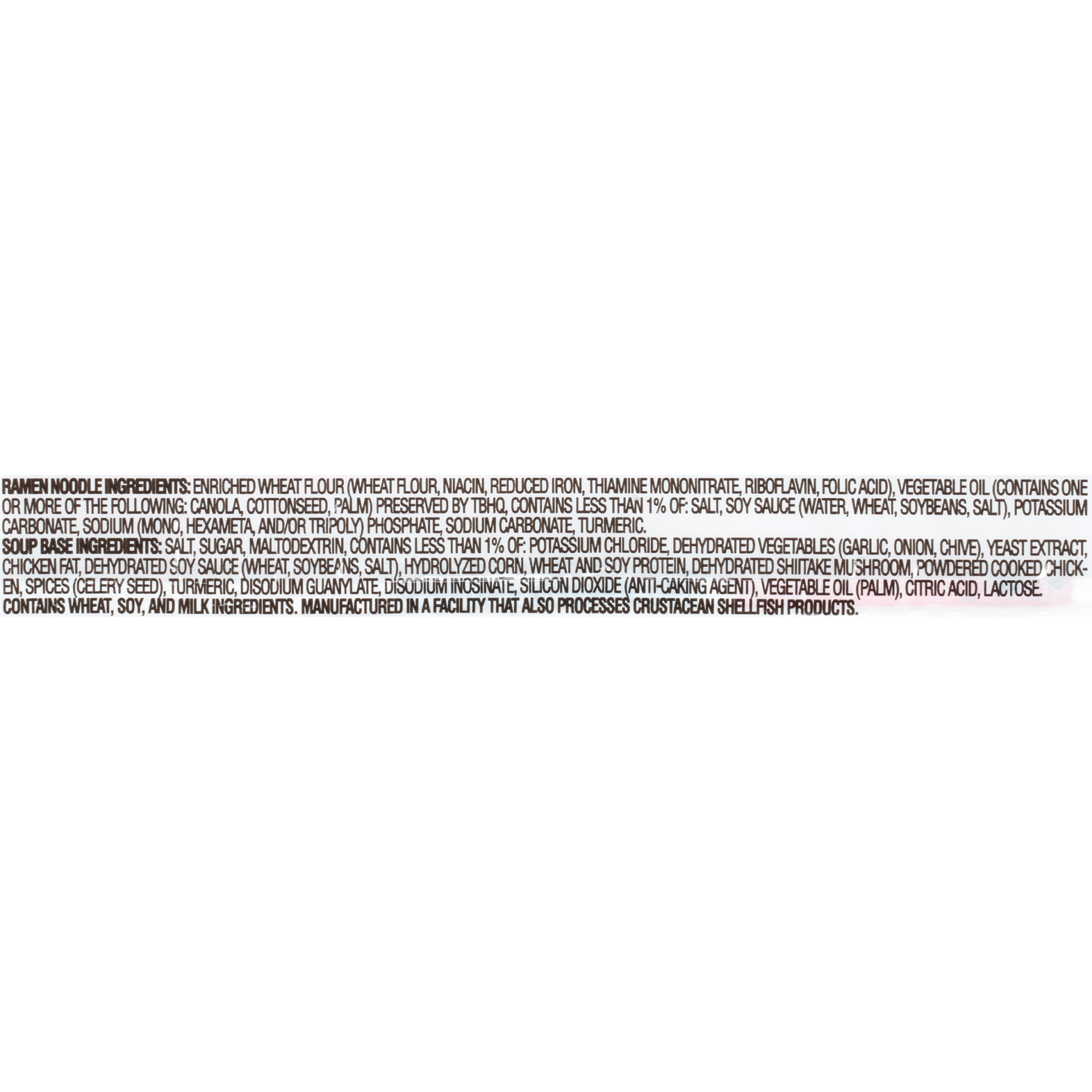 Ramen Noodle Ingredients: Enriched Wheat Flour (Wheat Flour, Niacin, Reduced Iron, Thiamine Mononitrate, Riboflavin, Folic Acid), Vegetable Oil Contains One or More of the Following: Canola, Cottonsee…