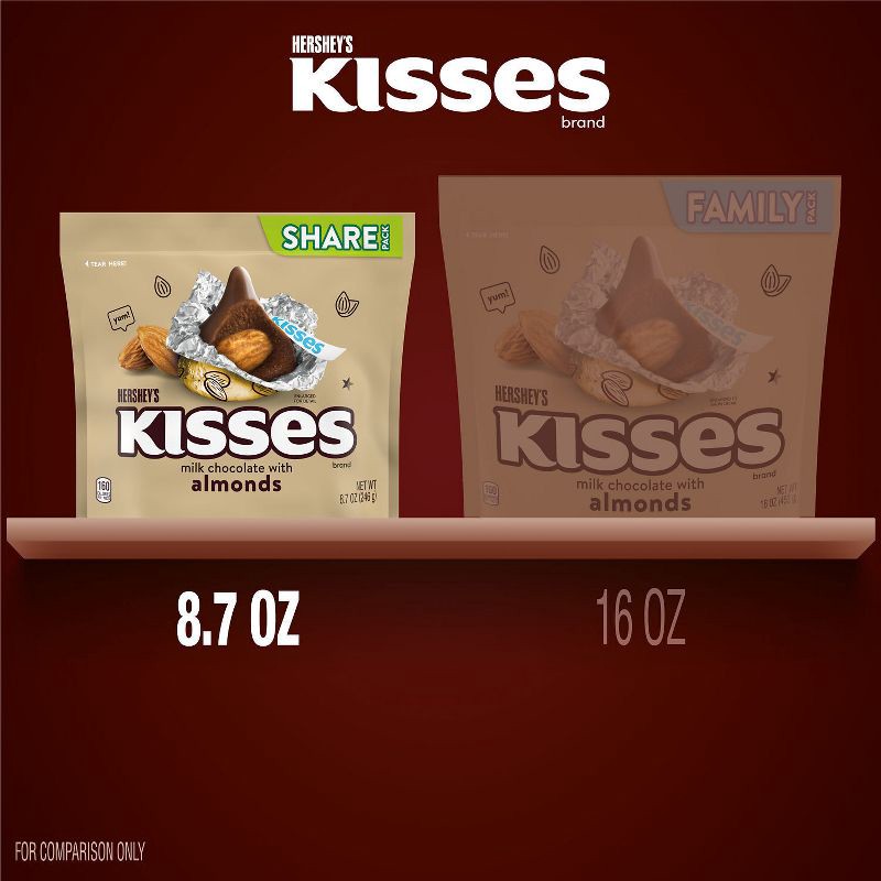 - Contains one (1) 8.7-ounce share pack of HERSHEY'S KISSES Milk Chocolate with Almonds Candy
