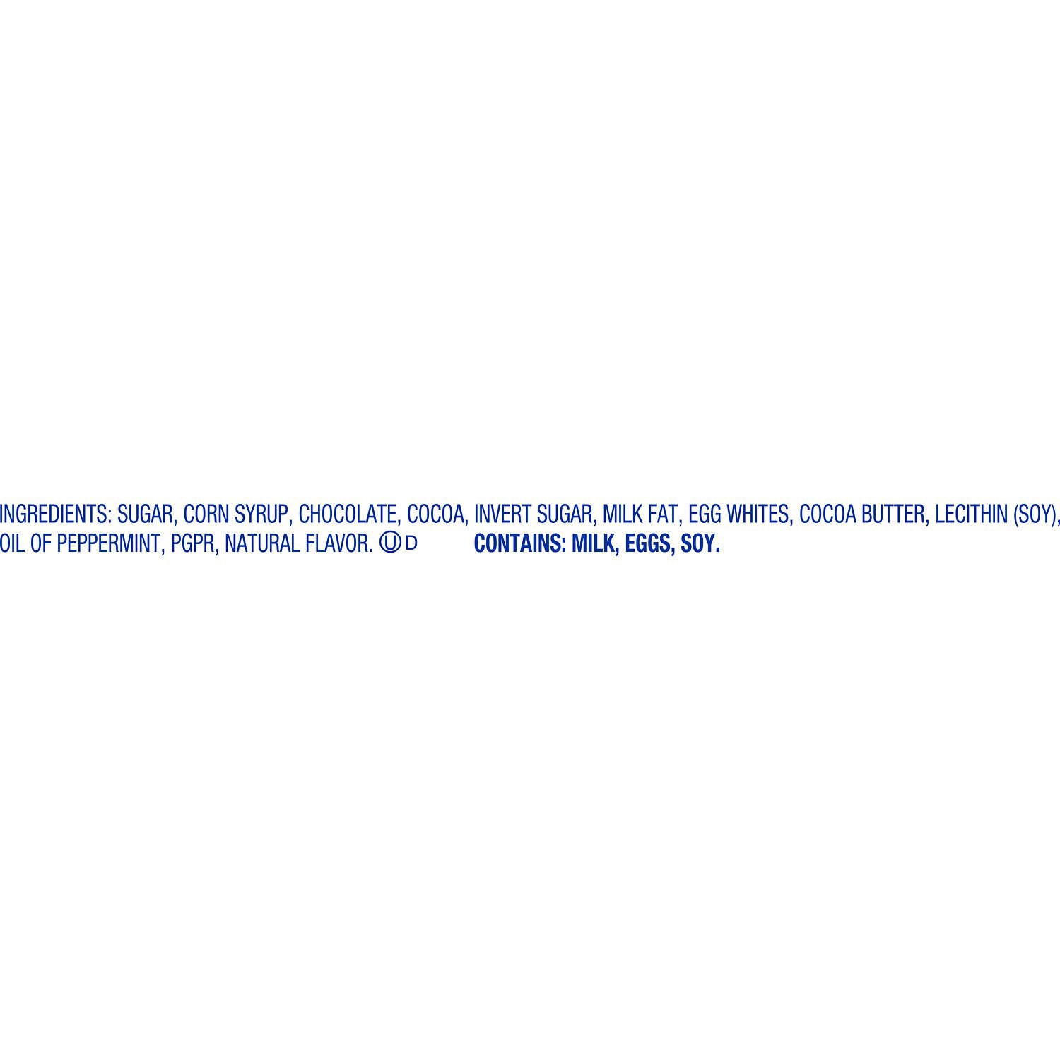 Sugar, Corn Syrup, Chocolate, Cocoa, Invert Sugar, Milk Fat, Egg Whites, Cocoa Butter, Lecithin (Soy), Oil of Peppermint, PGPR, Natural Flavor.