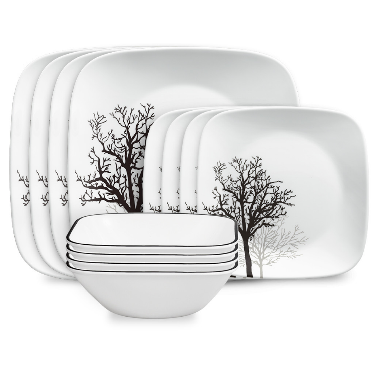 Black and gray trees sketch delicate silhouettes on our dinnerware set. The clean, modern lines and great durability complement everyday dining and entertaining with equal ease. 12-pc set includes: